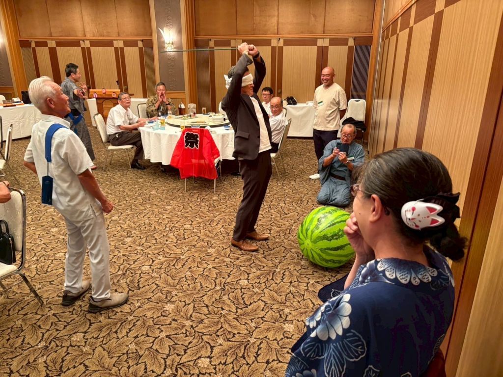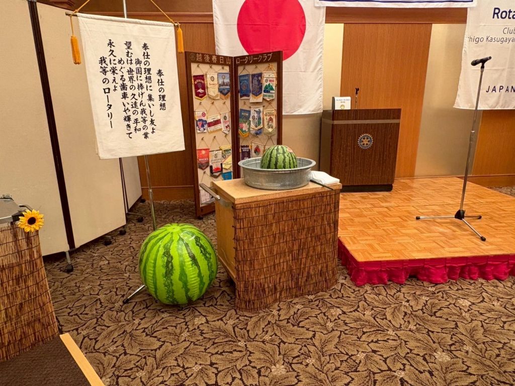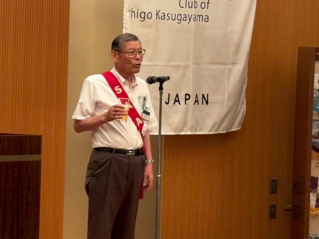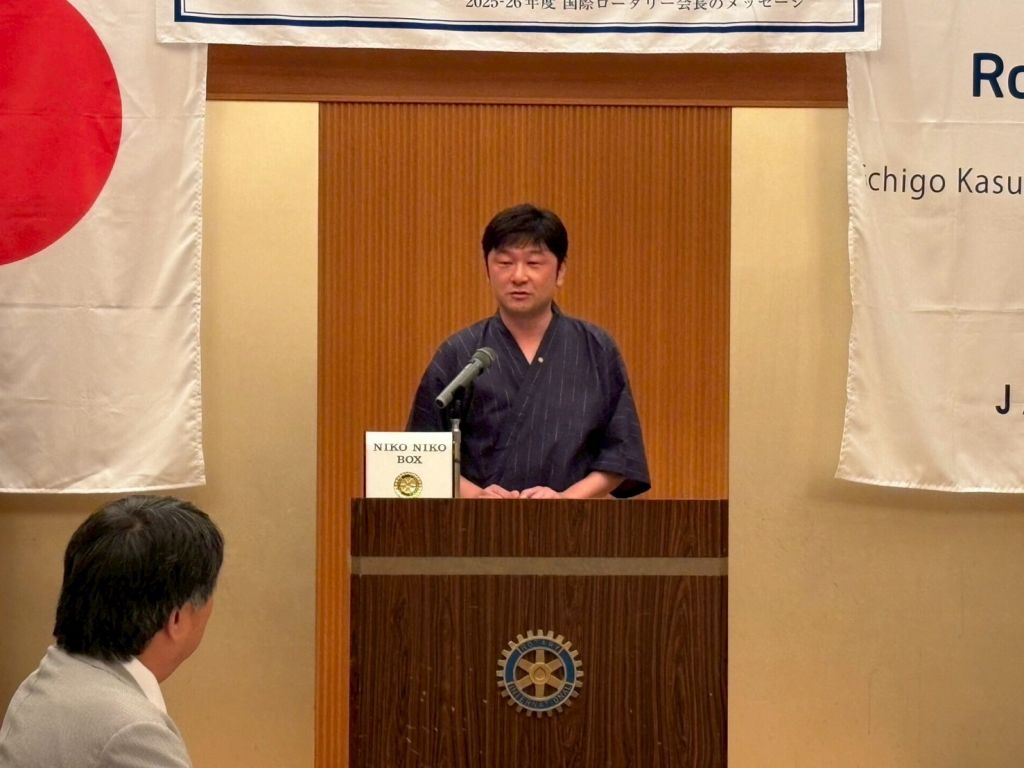本日の例会は夏の装いで参加するがテーマのドレスコード指定例会でした。そんな中、2560地区ガバナーノミニーの森田英様(糸魚川中央RC所属)と2027-28年度2560地区幹事の神谷勇一様(糸魚川中央RC所属)にもご参加いただきました。