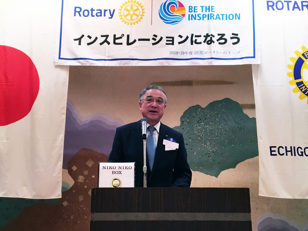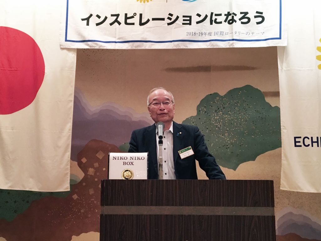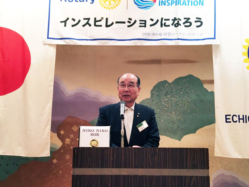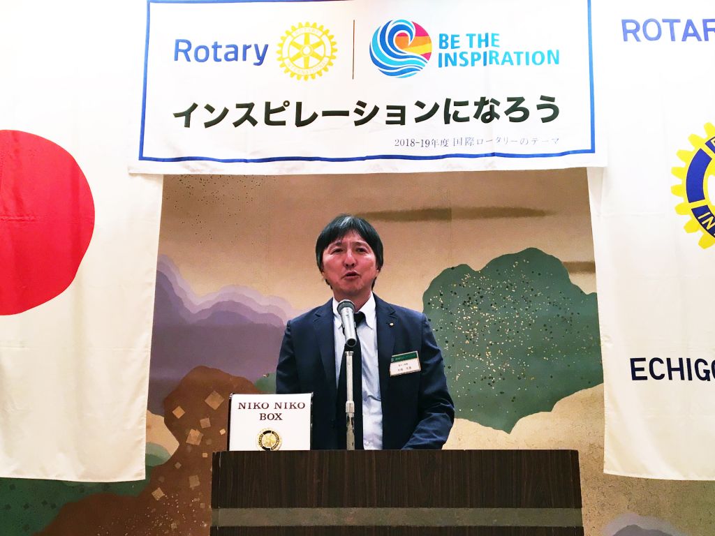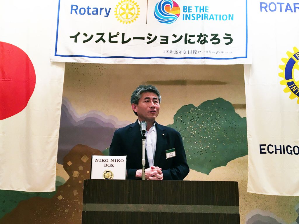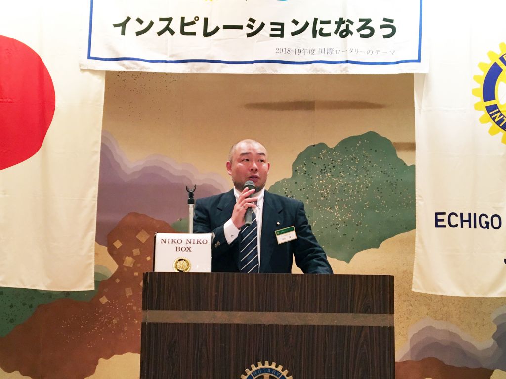 5月11日(土)に行われた国際ロータリー2560地区研修・協議会の実行委員長を務められた高田ロータリークラブの佐藤憲二様がお越しくださり、地区研修・協議会の協力へのご挨拶をいただきました。
