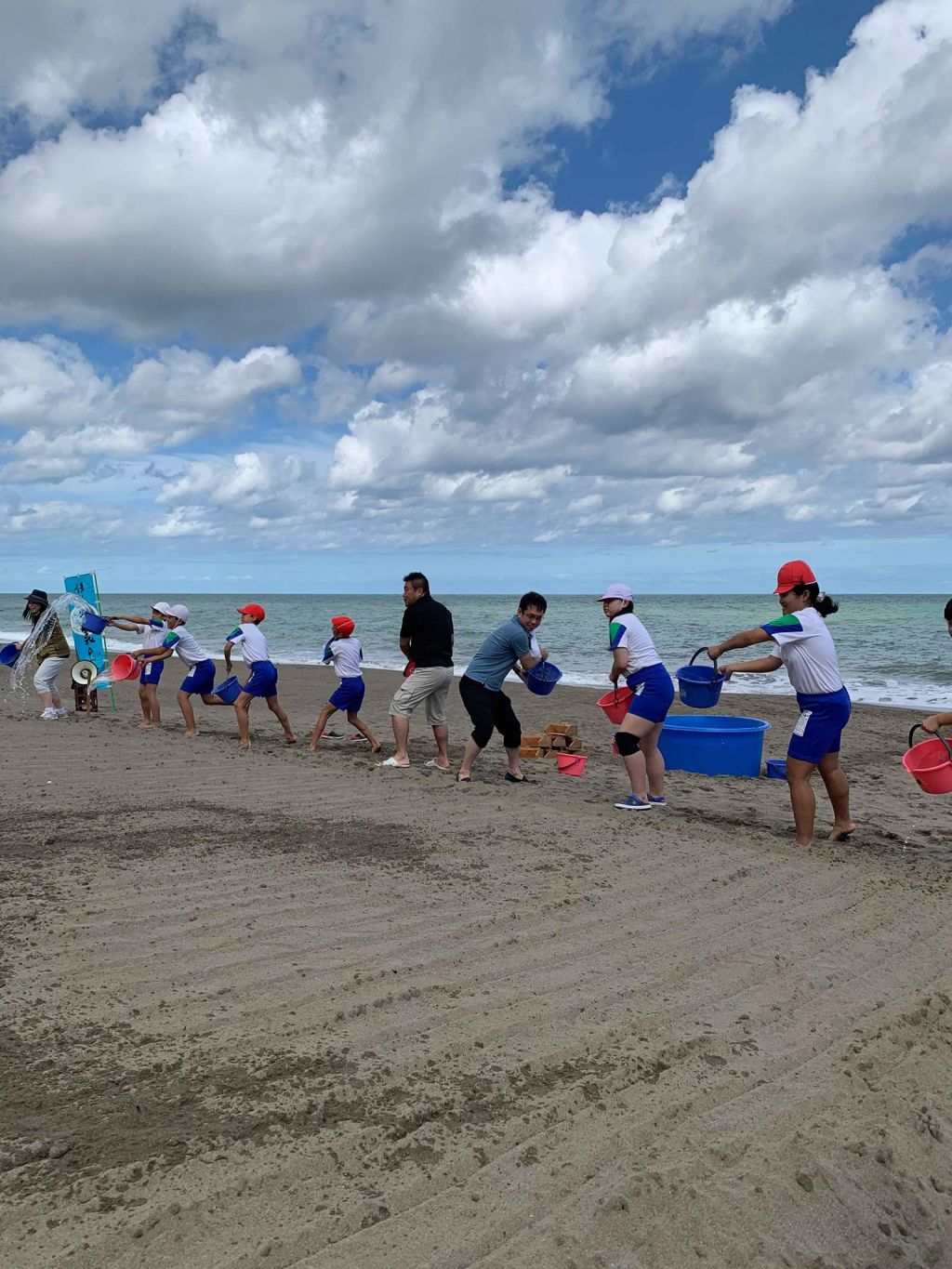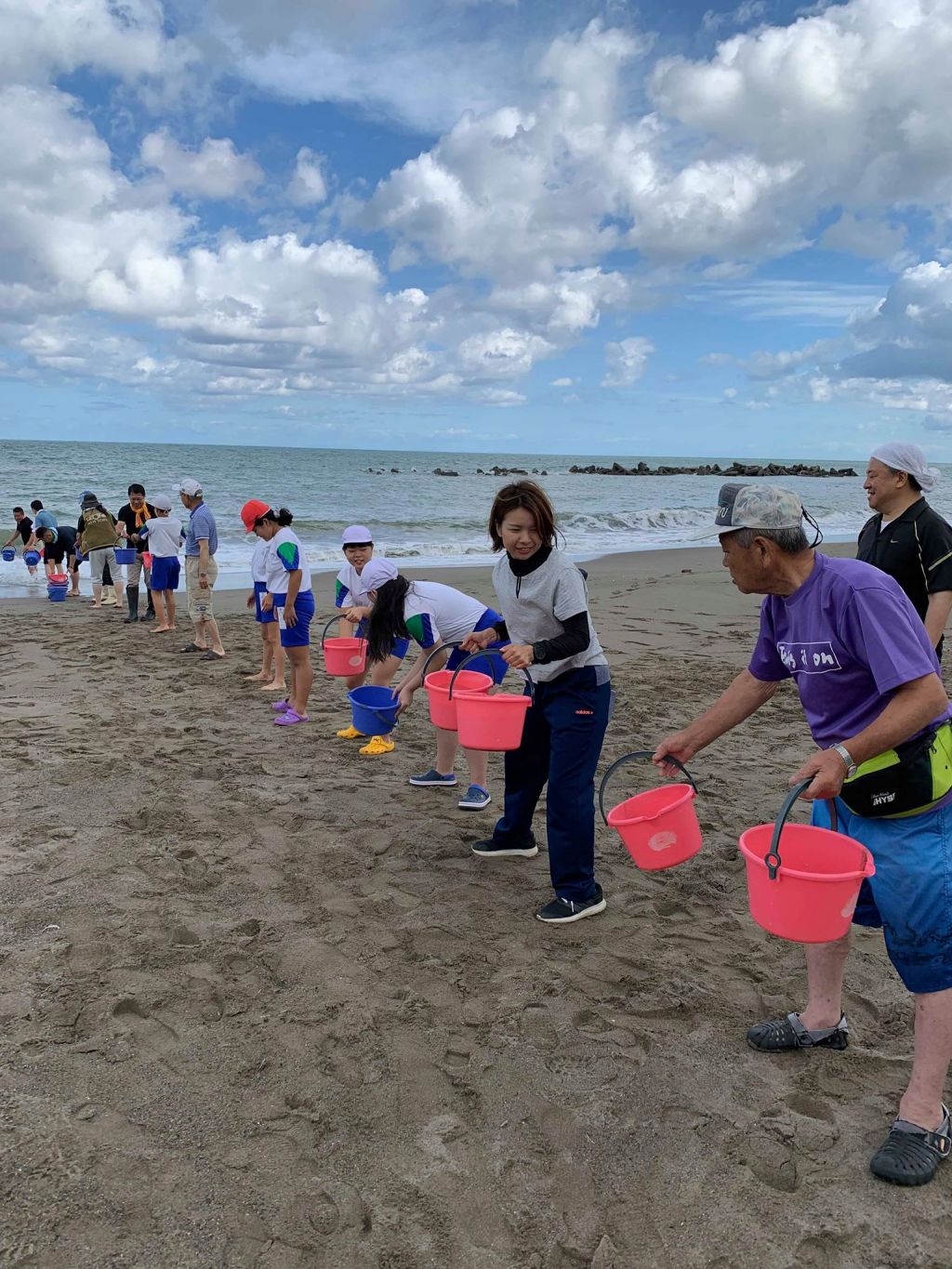 児童と当クラブ会員、外国人留学生が参加したバケツリレーで海水を運びます。