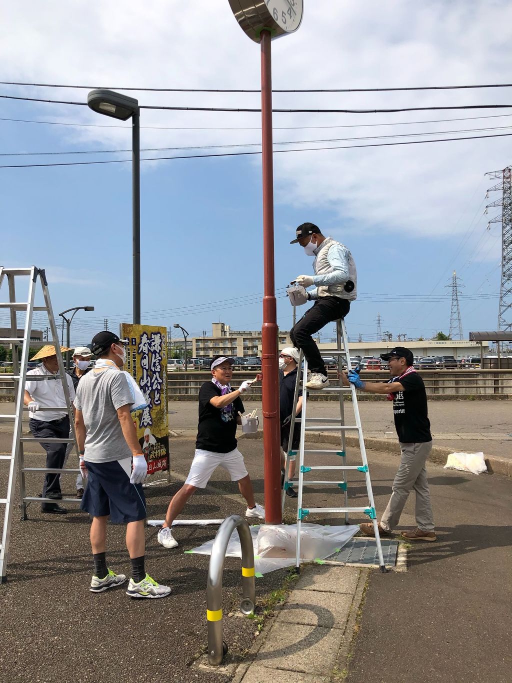 8/20(木)は例会の後、清掃奉仕活動を行いました。地元春日山駅周辺の清掃と、創立15周年を記念して当クラブが寄贈した時計塔の塗装を行いました。とても暑い中でしたが、13名が参加し、歩道も塔もキレイになりました。