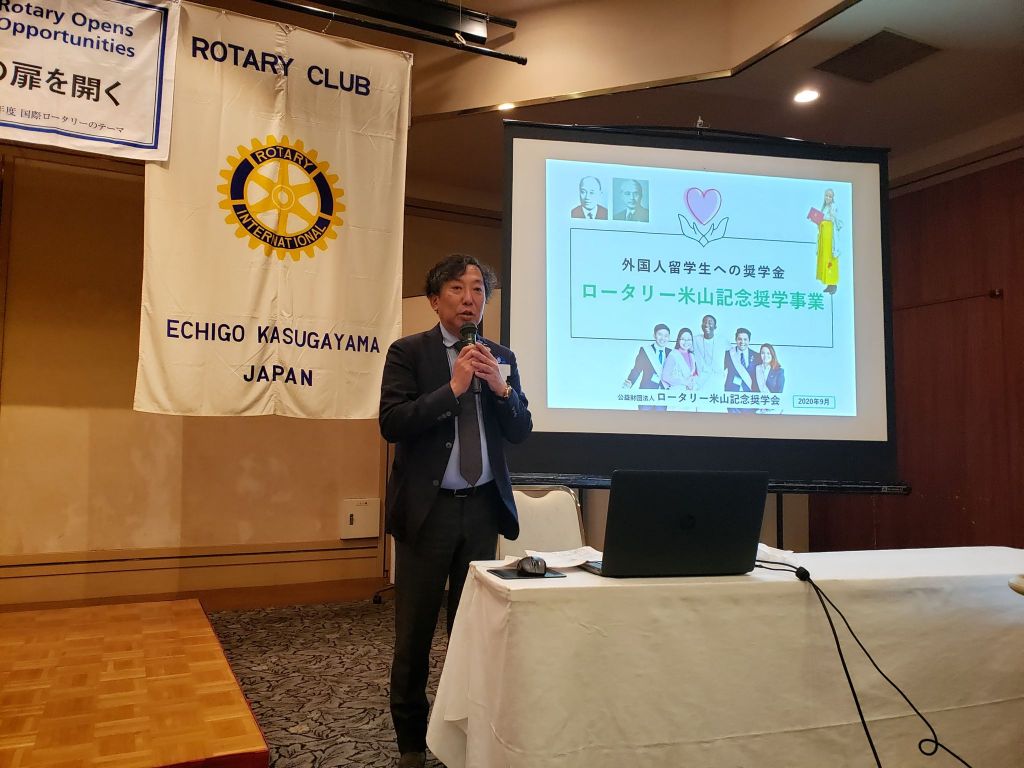 10/29(木)第18回例会を開催しました。第2560地区(新潟県)米山記念奨学委員会の中町圭介副委員長より「米山奨学」とは、どのような事業なのか、わかりやすく卓話をしていただきました。ロータリーが、将来の日本との架け橋になってもらえる外国人留学生を支援する大変重要な取り組みであるということを学ばせていただきました。