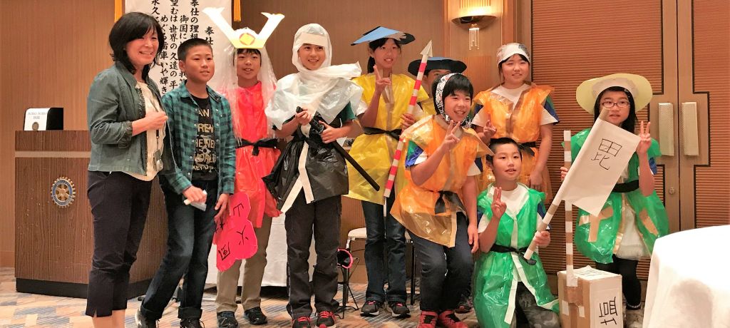 本日のプログラムは外部卓話で、先日行われた「義の塩作り体験」で、実際に塩作りを体験した上越市立谷浜小学校の児童9名と引率の先生、教頭先生にお越しいただきました。児童からは、昔の塩作りを再現した創作劇を披露していただきました。