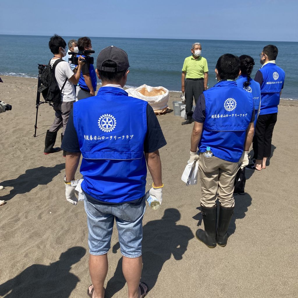 9/16(木)第12回(通算1381回)例会を開催しました。今回は、海岸清掃・移動例会となりました。快晴となった午前11時。谷浜海水浴場に集合。春日山ロータリーの上着を着た20名弱の会員が約1時間にわたり海岸清掃を行い、いい汗を流しました。海岸清掃、午後12時からは、すぐ近くの「シーサイドわかば」様で、移動例会を行いました。会長からは、「義の塩」の開催ができなかったことのお話等ありました。会員ご夫人誕生日は清水会員のご夫人でした。移動例会の後は、通称「カニ例会」と言われる所以となったズワイガニ付きのお弁当をいただきました。会員からのお漬物の差し入れがあり、参加した会員はおなか一杯になりました。御馳走様でした。