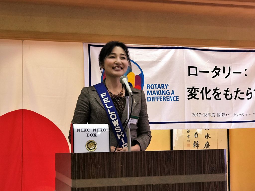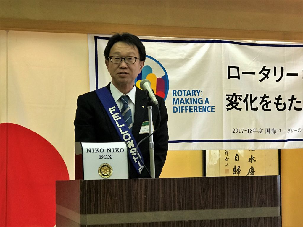 日馬会長からロータリバッジを授与し、また1人のロータリアンが仲間入りしました。ここ1ヶ月くらいに、4名の新会員が入会しことで、越後春日山ロータリークラブは一段と賑やかになり、そして楽しいクラブになってきました。