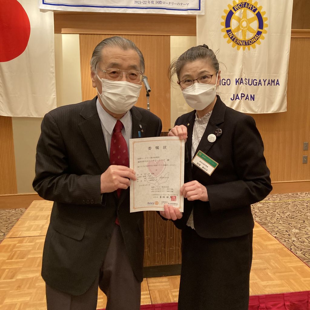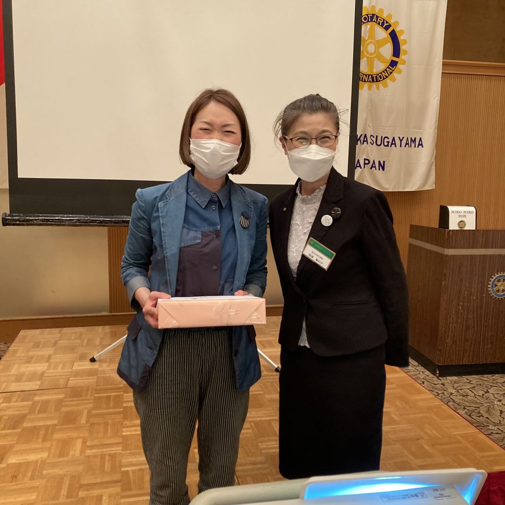 4/14(木)第42回(通算第1411回)例会を開催しました。稲葉会長の挨拶がありました。本日のセレモニーは、米山奨学生世話クラブとしての委嘱状の授与がありました。食事をはさみ、本日の卓話は、もんぺ製作所の赤木美名子さんでした。東京から吉川区への移住家族で移住して8年。夫は杜氏見習いお子様が1人、主に田植えで生計を立てつつ、もんぺの製作などいろいろなことにチャレンジをしている方です。高田縞をもんぺで復活させたいということでした。本日は時間が足りなくなりましたのでまた次回に卓話をお聞きしたいです。