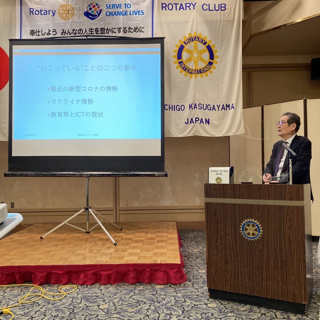 5月19日(木)第46回(通算1415回)例会を開催しました。本日は、MillionDallarMealの日です。小池ソングリーダーの指揮のもと国歌とロータリーソングの斉唱がありました。稲賀会長からの挨拶がありました。本日の来訪者は、卓話を行っていただく、関根学園理事長の渡邊隆様です。昼食をはさみ、委員会報告が大島国際委員長よりありました。そして渡邊隆様より卓話。今の教育界で起こっていることという内容でした。非常にわかりやすい内容で、教育界がICTの時代に大きく変わろうとしているということをお聞きました。ありがとうございました。