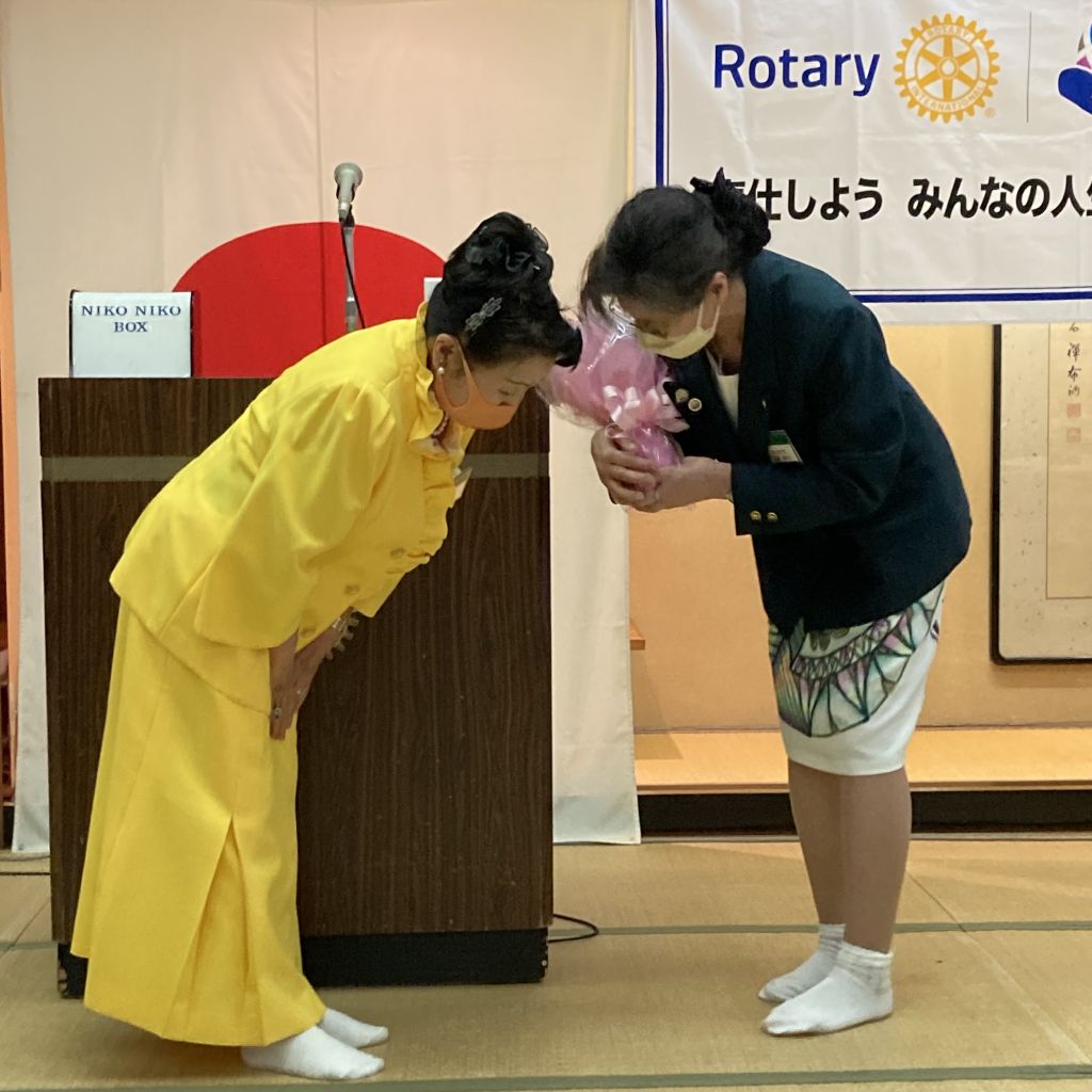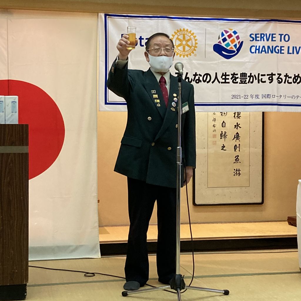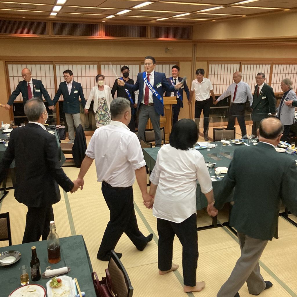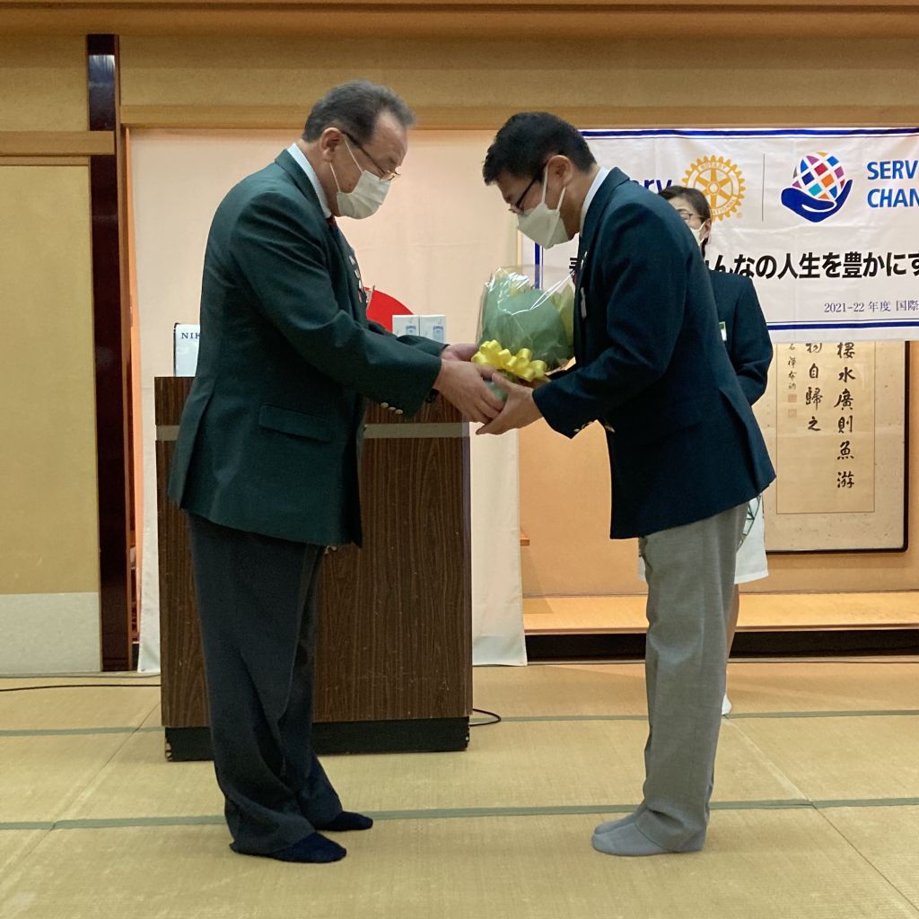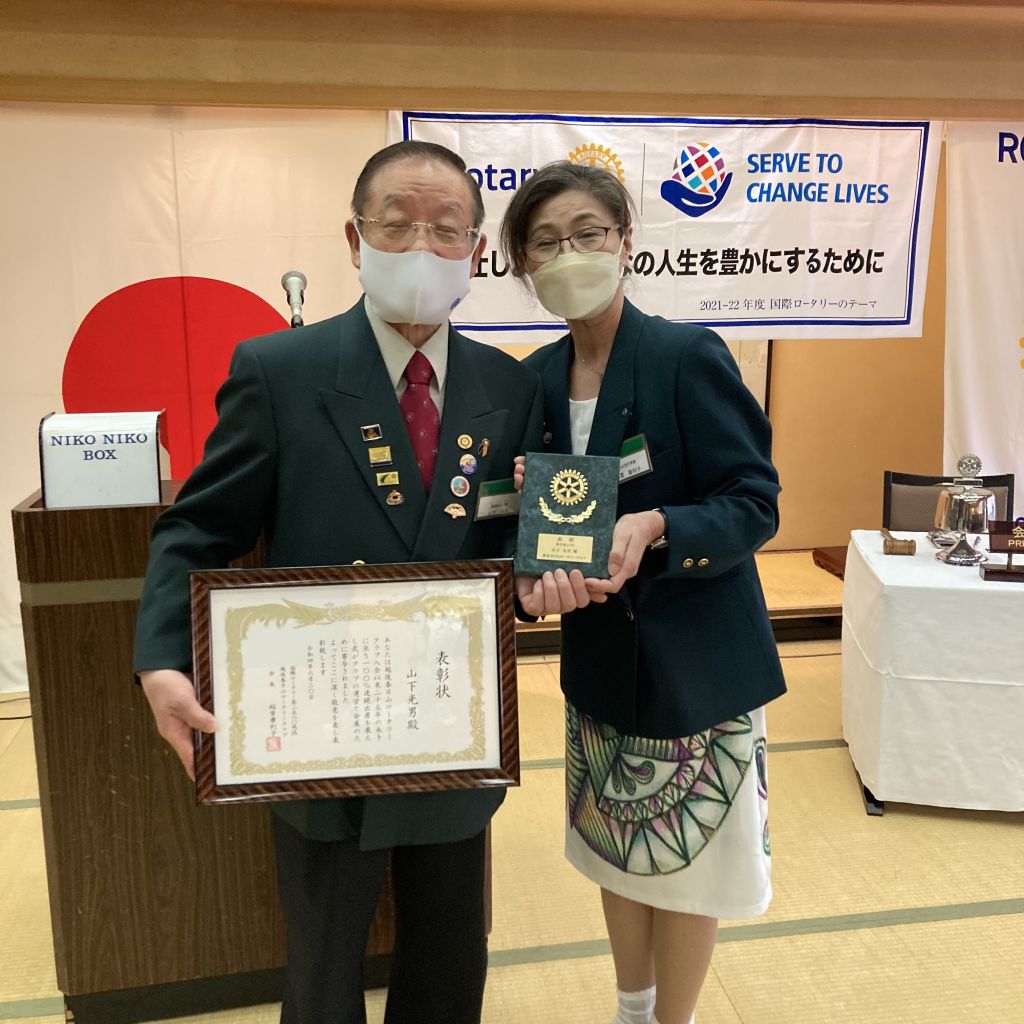 6/30(木)第53回(通算1422回)例会を例会場であるハイマートにて開催しました。稲葉会長・徳道幹事年度の最終例会のため夜例会とし例会後は会長幹事慰労を兼ねた親睦会となりました。稲葉会長から1年を振り返り挨拶がありました。本日のセレモニーは21-22年度の19名にのぼる皆出席者の表彰です。25年山下光男パスト会長、24年河野元彦パスト会長、19年大嶋浩文パスト会長、12年秋山政一パスト会長、11年風間常樹彦パスト会長、10年荒川憲彦幹事エレクト、稲賀摩利子会長、水嶋光彦パスト会長、峯村正文パスト会長、8年徳道茂幹事、7年石原博会員、5年佐藤隆義会長エレクト、4年藤田明仁パスト会長、3年小池貴宏会員、1年斎藤将彦会員、内山勇人会員、山崎和夫会員となりました。代表してチャーターメンバーでもある山下パスト会長へ稲葉会長から表彰状が手渡されました。この後稲葉会長、徳道幹事から次年度の会長幹事へのバッジ引継ぎ式が行われ、稲葉会長と徳道幹事へ花束が贈呈されました。1年間本当にご苦労様でした。例会終了後は親睦会となり山下パスト会長から乾杯の御発声がありました。美味しいお食事をいただきながら会長幹事への慰労と親睦の会が執り行われました。宴も終盤になり小池ソングリーダーの指揮のもと、「手に手つないで」を歌い全員が輪になりました。最後は風間第7分区ガバナー補佐から〆のお言葉を頂戴し会が終了となりました。皆様ご苦労様でした。また新たな年度よろしくお願いいたします。