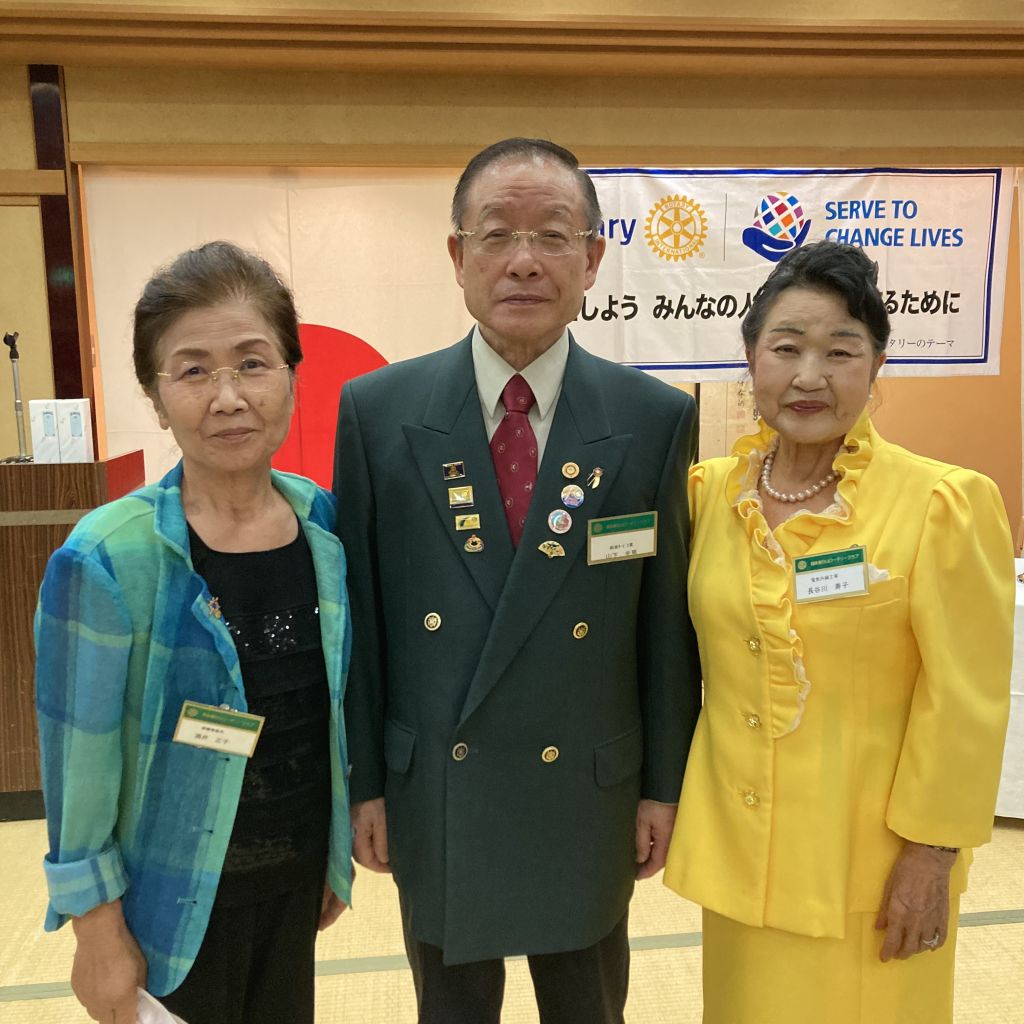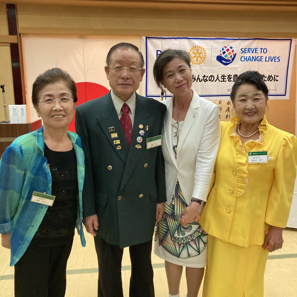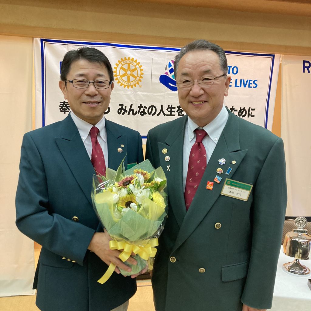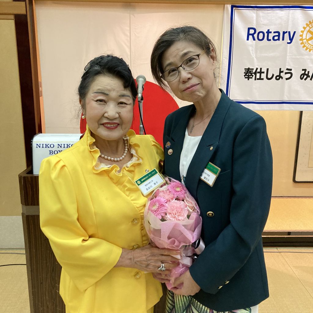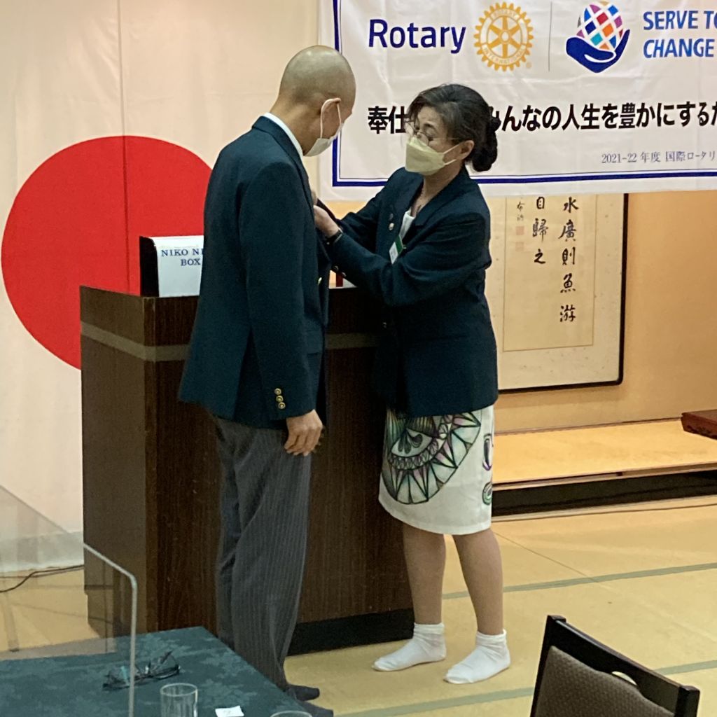 6/30(木)第53回(通算1422回)例会を例会場であるハイマートにて開催しました。稲葉会長・徳道幹事年度の最終例会のため夜例会とし例会後は会長幹事慰労を兼ねた親睦会となりました。稲葉会長から1年を振り返り挨拶がありました。本日のセレモニーは21-22年度の19名にのぼる皆出席者の表彰です。25年山下光男パスト会長、24年河野元彦パスト会長、19年大嶋浩文パスト会長、12年秋山政一パスト会長、11年風間常樹彦パスト会長、10年荒川憲彦幹事エレクト、稲賀摩利子会長、水嶋光彦パスト会長、峯村正文パスト会長、8年徳道茂幹事、7年石原博会員、5年佐藤隆義会長エレクト、4年藤田明仁パスト会長、3年小池貴宏会員、1年斎藤将彦会員、内山勇人会員、山崎和夫会員となりました。代表してチャーターメンバーでもある山下パスト会長へ稲葉会長から表彰状が手渡されました。この後稲葉会長、徳道幹事から次年度の会長幹事へのバッジ引継ぎ式が行われ、稲葉会長と徳道幹事へ花束が贈呈されました。1年間本当にご苦労様でした。例会終了後は親睦会となり山下パスト会長から乾杯の御発声がありました。美味しいお食事をいただきながら会長幹事への慰労と親睦の会が執り行われました。宴も終盤になり小池ソングリーダーの指揮のもと、「手に手つないで」を歌い全員が輪になりました。最後は風間第7分区ガバナー補佐から〆のお言葉を頂戴し会が終了となりました。皆様ご苦労様でした。また新たな年度よろしくお願いいたします。
