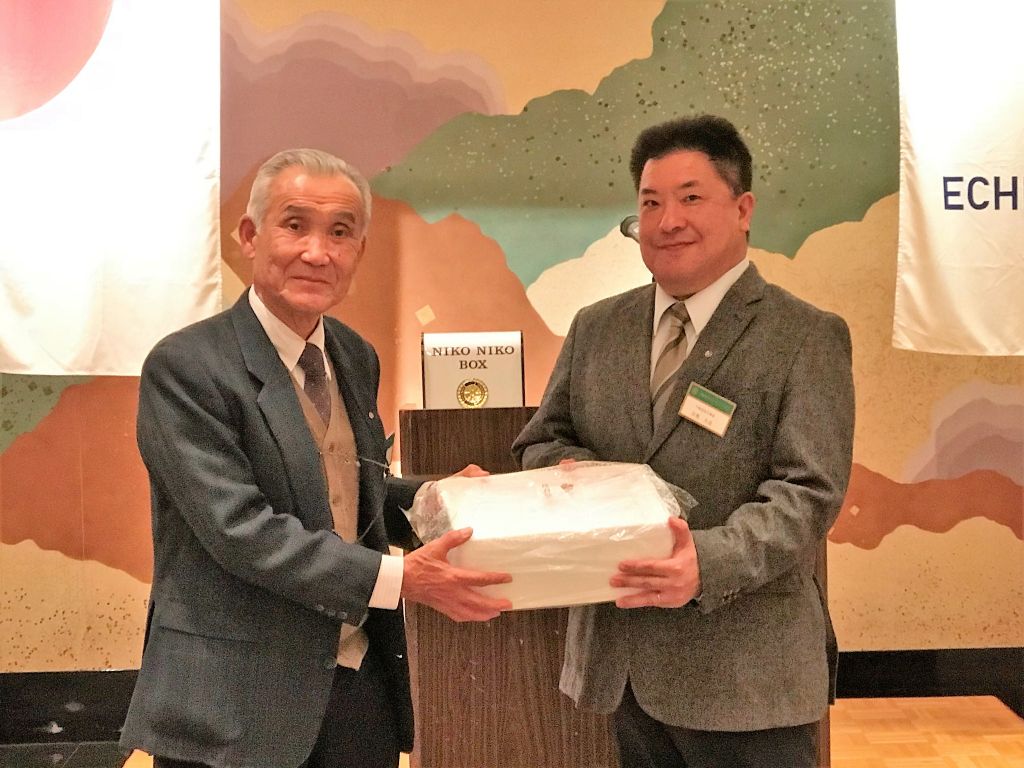 開式早々に、昨日(29日)行われた、当クラブのゴルフコンペの表彰式を行いました。9名の会員が参加して、米山水源カントリークラブを会場に行われ、あいにくのお天気のなか脱落者もなく、最後まで元気にプレーができました。そして、水嶋直前会長が、見事優勝の栄冠を手に入れました。