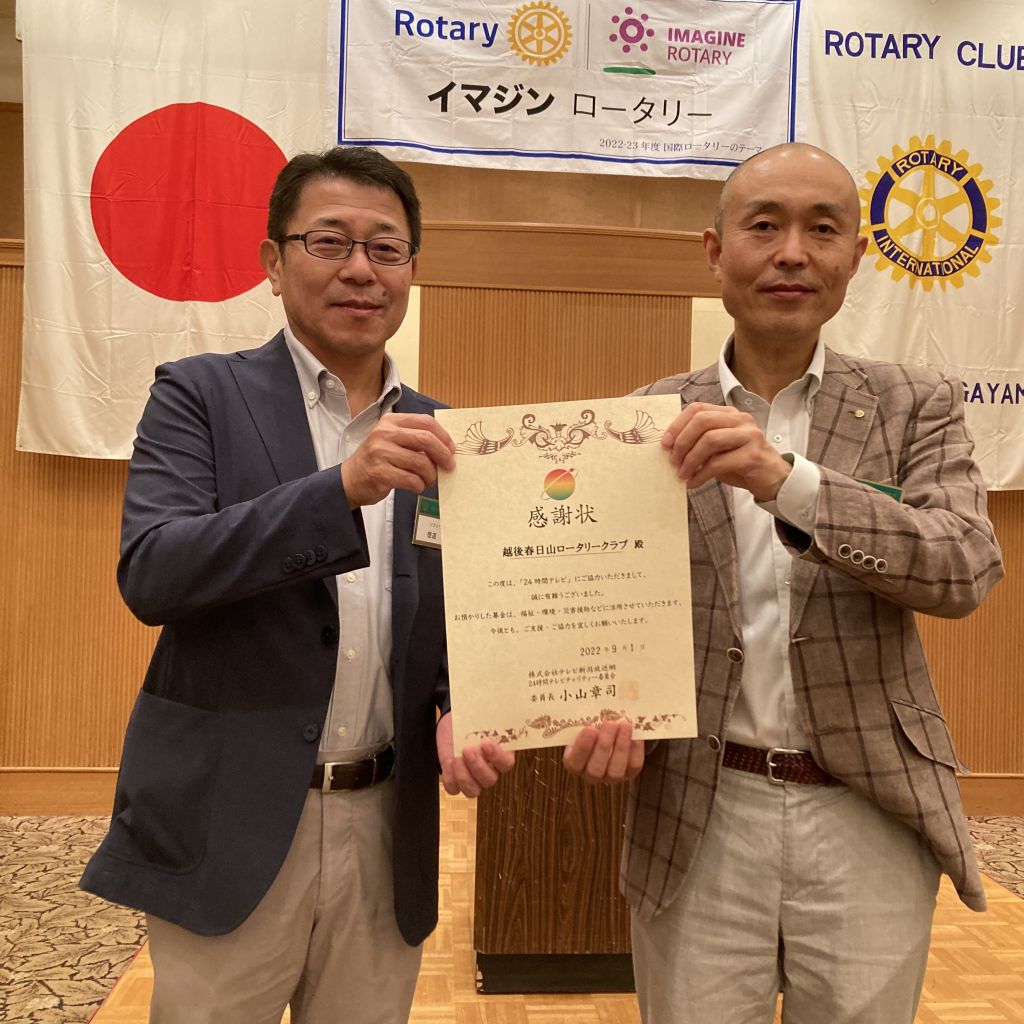 9/15(木)第11回(通算1433回)例会を開催しました。本日は、MillionDollarMealの日、例会後は海岸清掃となります。佐藤会長から挨拶がありました。本日のセレモニーは会員誕生日、長谷川パスト会長と大濱会員でした。会員ご婦人誕生日は清水会員でした。食事をはさみ委員会報告では、先月実施しました24時間テレビチャリティー募金に対し、同チャリティー委員会から感謝状が出され、徳道委員長から佐藤会長へ手渡されました。またロータリーの友9月号の見どころ紹介、高橋パスト会長からのお話、小池会員からの地区大会ゴルフ、石原委員長からこの後の清掃活動のお話がありました。そして例会を少し早く終了し、上越市郷津海岸へ。当ロータリークラブの奉仕活動として海岸清掃を行いました。まだ暑い時期でしたが会員はせっせと汗をかきごみ拾いを行いました。参加された会員の皆様お疲れ様でした。