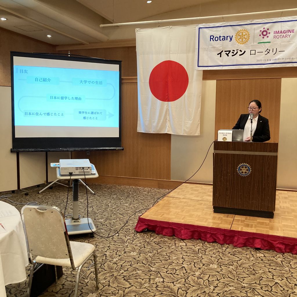 6/1(木)第48回(通算第1468回)例会を開催しました。本日は5月分のMillionDallarMealの日です。月始めの例会のため清水ソングリーダー指揮のもと、国歌とロータリーソングの斉唱がありました。その後佐藤会長から挨拶がありました。本日の来訪者は米山奨学生の許さんです。奨学金授与の後、卓話を行ってもらいます。昼食をはさみ、許さんから出身地の紹介、日本で奨学生になった理由、日本に来てみた感想、この1年にわたり活動してきた様子をスライドを用いて説明してもらいました。充実した留学生活を行っていることがよく伝わる良い報告でした。許さん本日はご苦労様でした。またクラブ戦略委員会の宮﨑委員長より先日行ったクラブをよりよくしていくための会員アンケートの内容から優先順位を決め取り組んでいく旨の説明がありました。