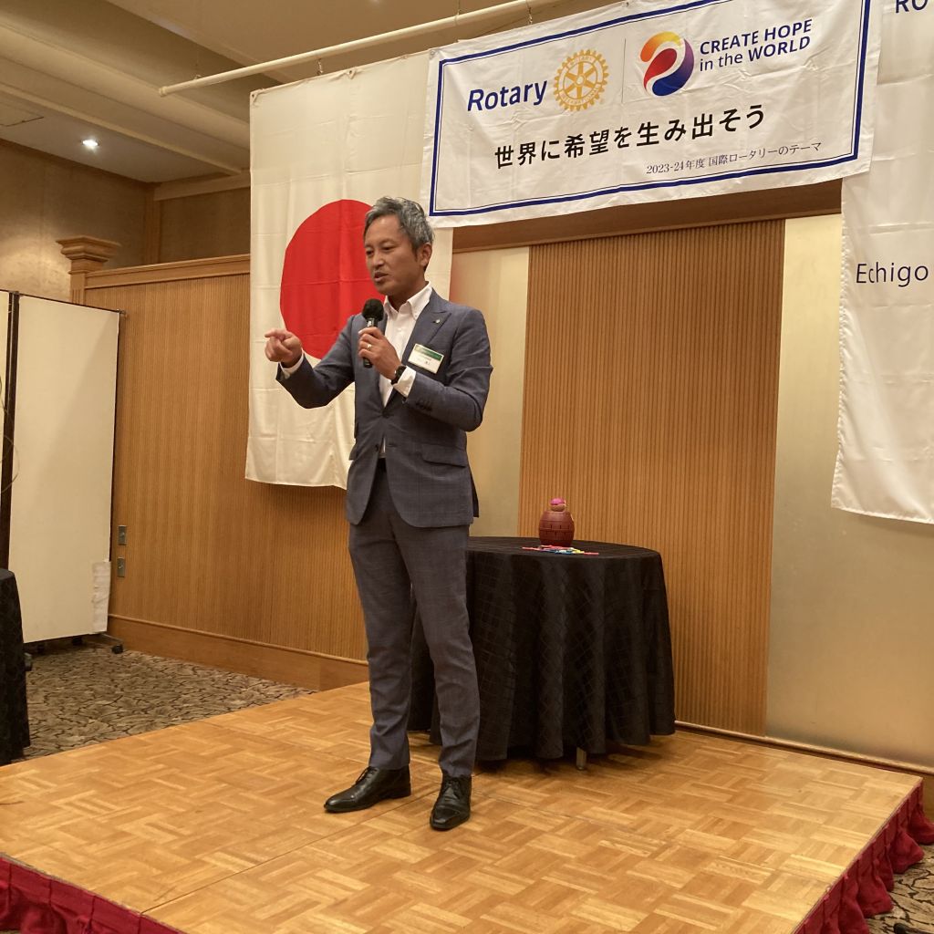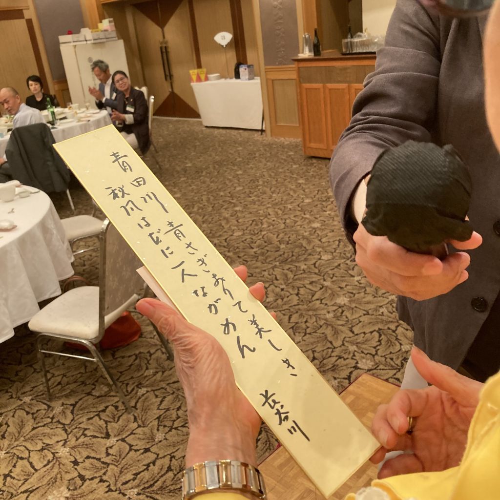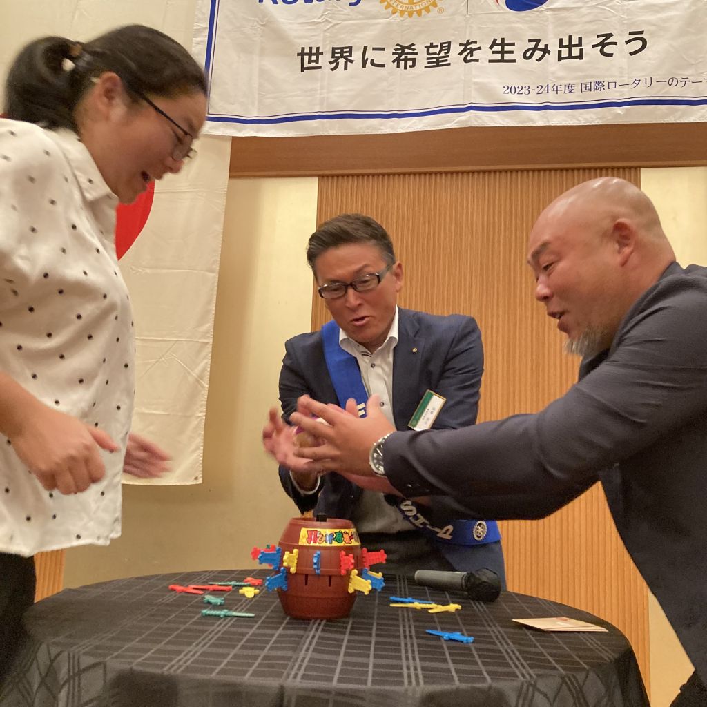 9/21(木)第12回例会を開催しました。9/29が中秋の名月ということに合わせ、例会は、お月見夜例会となりました。会場には特別にススキと団子、そして大きな月が配置されました。徳道会長から挨拶があり通常の例会を終了し、懇親会へと展開しました。抽選で乾杯のご発声となった宮田会員。米山奨学生の許さんも参加です。本日は、当クラブのゴルフ同好会主催のゴルフ会(@松ヶ峯カントリー倶楽部)でしたので、ゴルフの成績発表となりました。ぺリアを制したのは徳道会長。満面の笑みです。また懇親会では、テーブルごとに俳句を考え、それを親睦委員会の小池委員長が句を読み上げ、徳道会長が優秀賞を決定する催しが行われました。誰が作った句かは内緒での発表です。長谷川会員の句が見事、優秀賞ということになりました。その後恒例?の徳道会長危機一髪ゲームとなり。全部のテーブルが見事徳道会長を拾い上げ勝ちとなりました。閉めの挨拶は、抽選で決まった内山会員。最後は手に手をつないでで懇親会を終わらせていただきました。皆様ご苦労様でした。