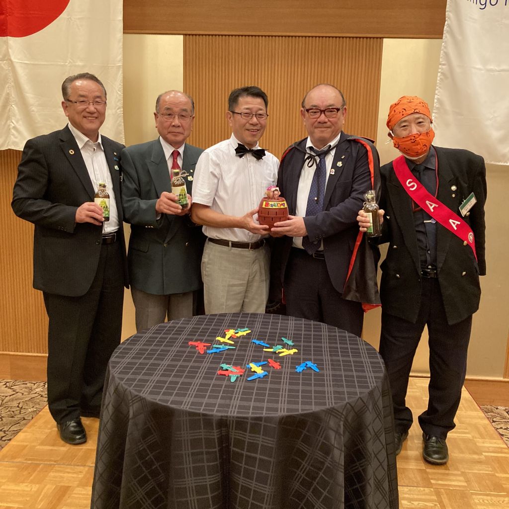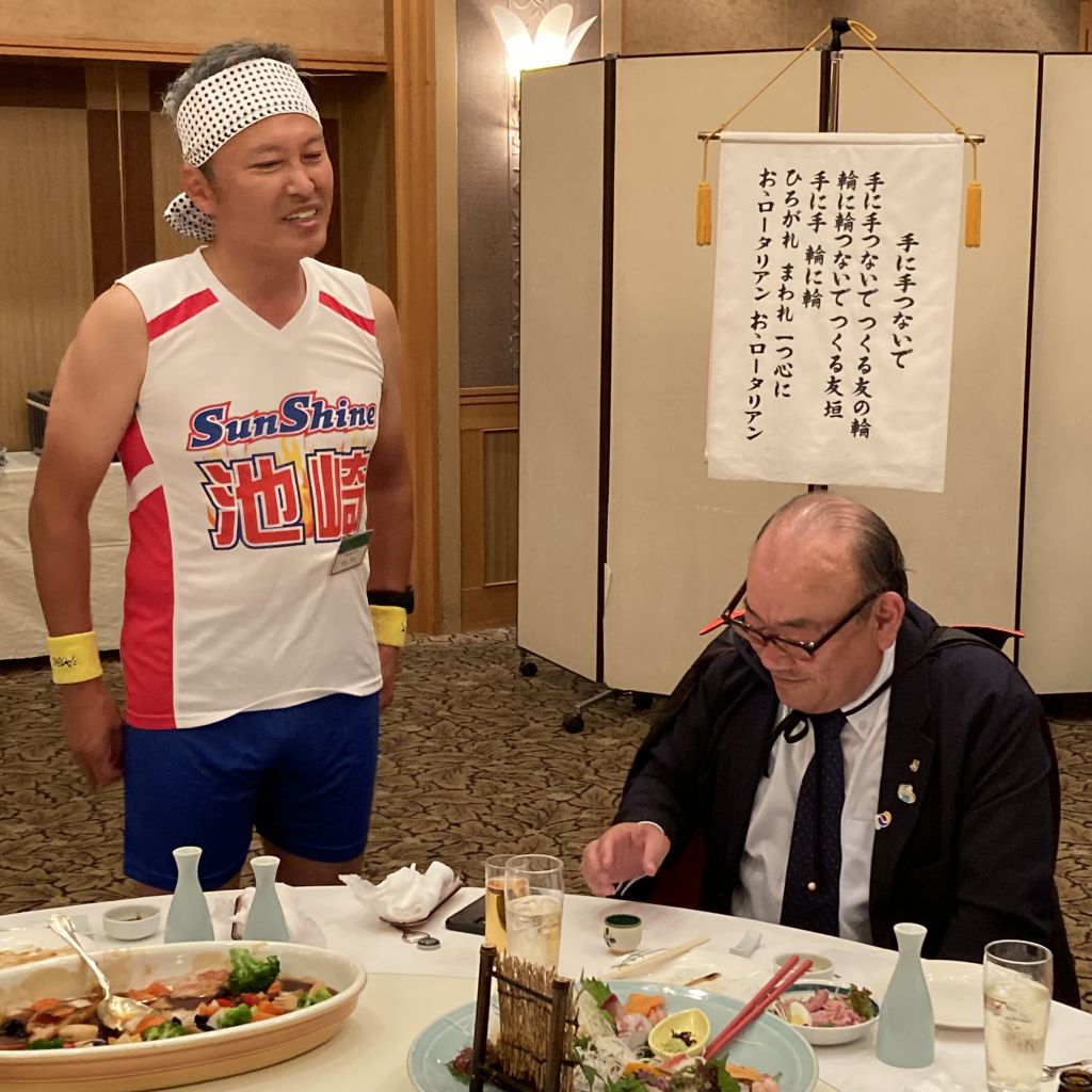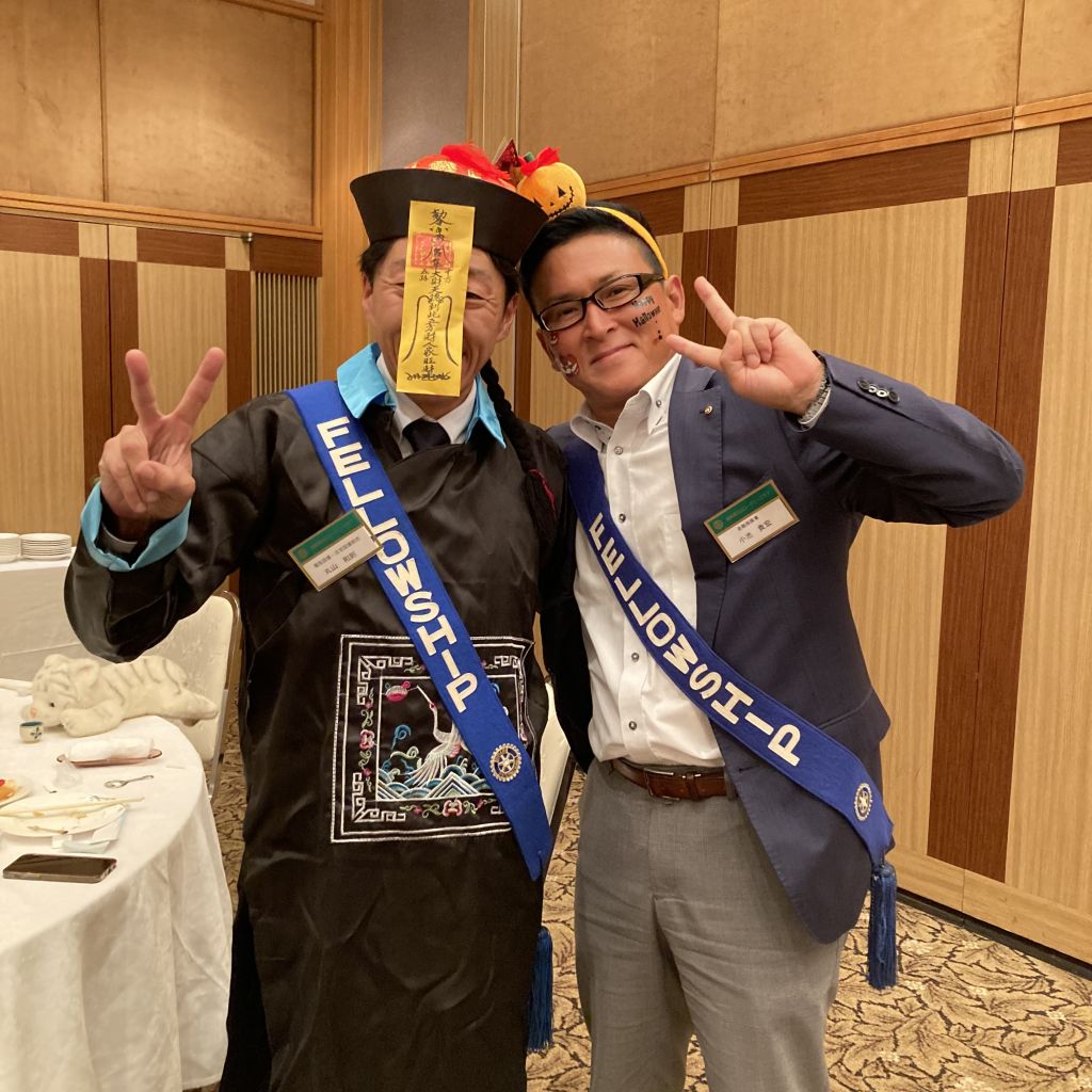 10/5(木)例会の前に、第7分区ガバナー補佐前川秀樹様をお迎えし、クラブ協議会を開催しました。ガバナー訪問に先立って当クラブの運営方針や各委員会の事業計画についてヒアリングを講評をいただきました。その後第14回(通算第1486回)例会を開催しました。少し早いハロウィン例会ということで、例会後はハロウィンの懇親会となりました。例会はクラブ協議会からの流れで前川第7分区ガバナー補佐の前川さんが来訪者として参加されました。小池ソングリーダーの式の元君が代とロータリーソングの斉唱がありました。続いて徳道会長から挨拶がありました。本日のセレモニーは月初めのということで、会員誕生日と会員ご夫人誕生日を記念する花束が当クラブから渡されました。例会を終了後、ハロウィン夜例会ということで懇親会となりました。会員は何かワンポイントでもよいので、仮装をするというルールの元に行いました。そして、恒例の徳道会長危機一髪ゲームを行いました。最後に仮装は誰が一番目立っていたかと徳道会長から選んでもらうということで、サンシャイン池崎に仮装した内山会員が選ばれました。最後は手に手をつなぎを輪になって歌い、風間さんから〆のご発声をいただきました。前川ガバナー補佐まで仮装をしていただきありがとうございました。会員の皆様ご苦労様でした。
