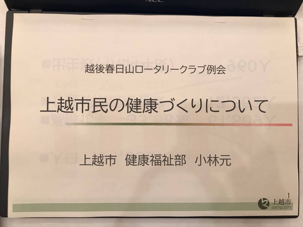11/30(木)第22回(通算第1494回)例会を開催しました。本日は上越市健康福祉部長の小林元様をお招きして「上越市民の健康づくりについて」というテーマで講和をいただきました。現在の国保に加入されている上越市民の健康状況や福祉部の取り組みなどについてお話をいただきました。また、統計から見る傾向や全国と上越市を比較した分析などわかり易く解説していただき、私たち個人個人が積極的に健診に参加しなければならない必要性などをあらためて知る機会となりました。小林部長様大変ありがとうございました。