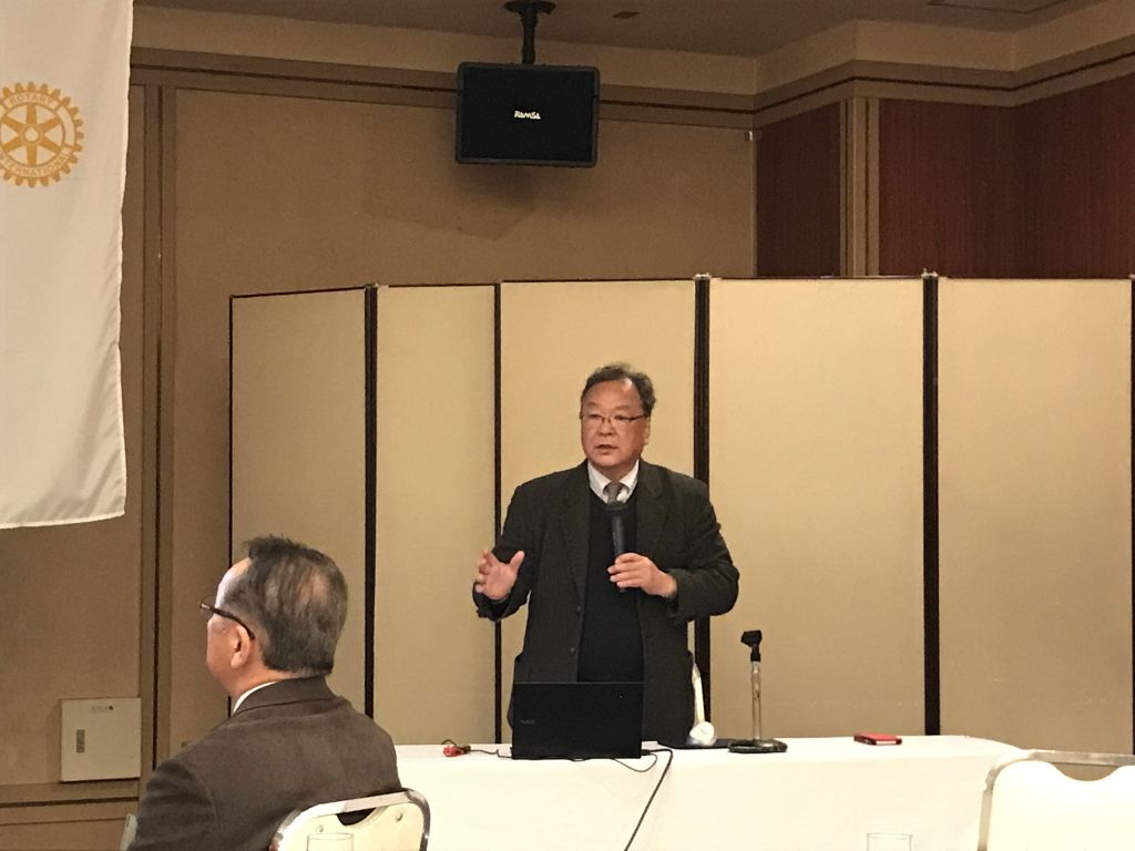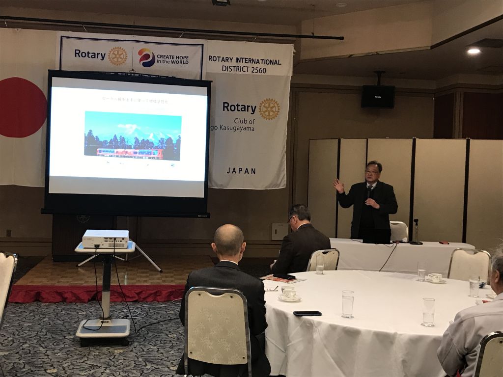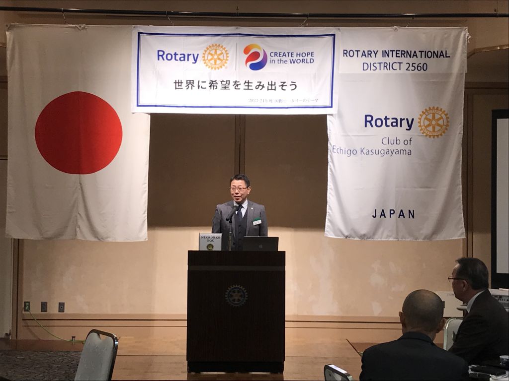 12/7(木)第23回(通算第1495回)例会を開催しました。12月最初の例会のため国歌を斉唱いたしました。また、本日は会員誕生日およびご夫人の誕生日セレモニーが行われました。委員長報告では、風間社会奉仕委員長から21日のクリスマス家族例会でチャリティ・バザーを開催する旨の報告がありました。そして、大嶋青少年奉仕委員長からは次年度の交換留学生についてお話がありました。その後に昼食を挟み、本日はえちごトキめき鉄道代表取締役社長の鳥塚亮様をお招きし鳥塚社長様が就任され取り組まれてこられたことお話をいただきました。観光リゾート列車の「雪月花」や直江津D51レールパークなど観光への取り組みや、また、高校生が電車を多く利用することから電車の待ち時間などを学習に活用してもらうための居場所の提供など、人づくりへの想いなど私たちのお手本となる貴重なお話を伺うことができました。鳥塚社長様大変ありがとうございました。