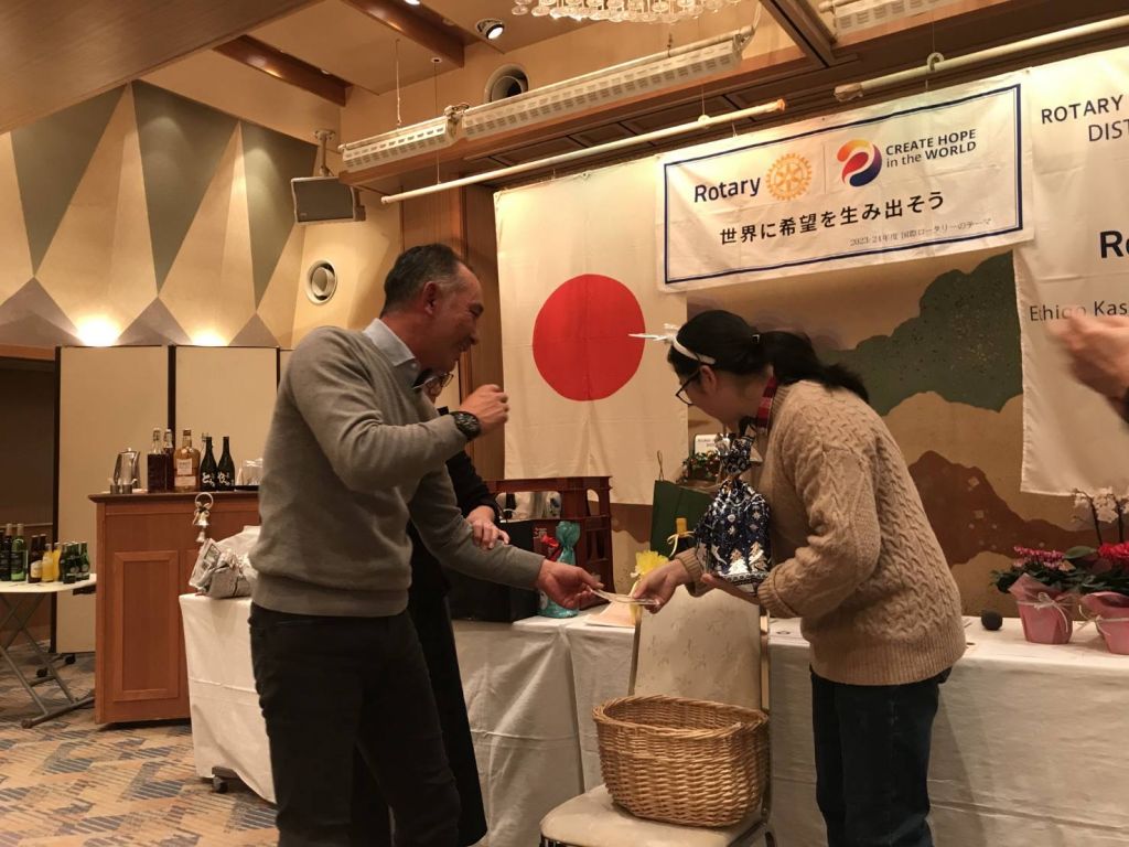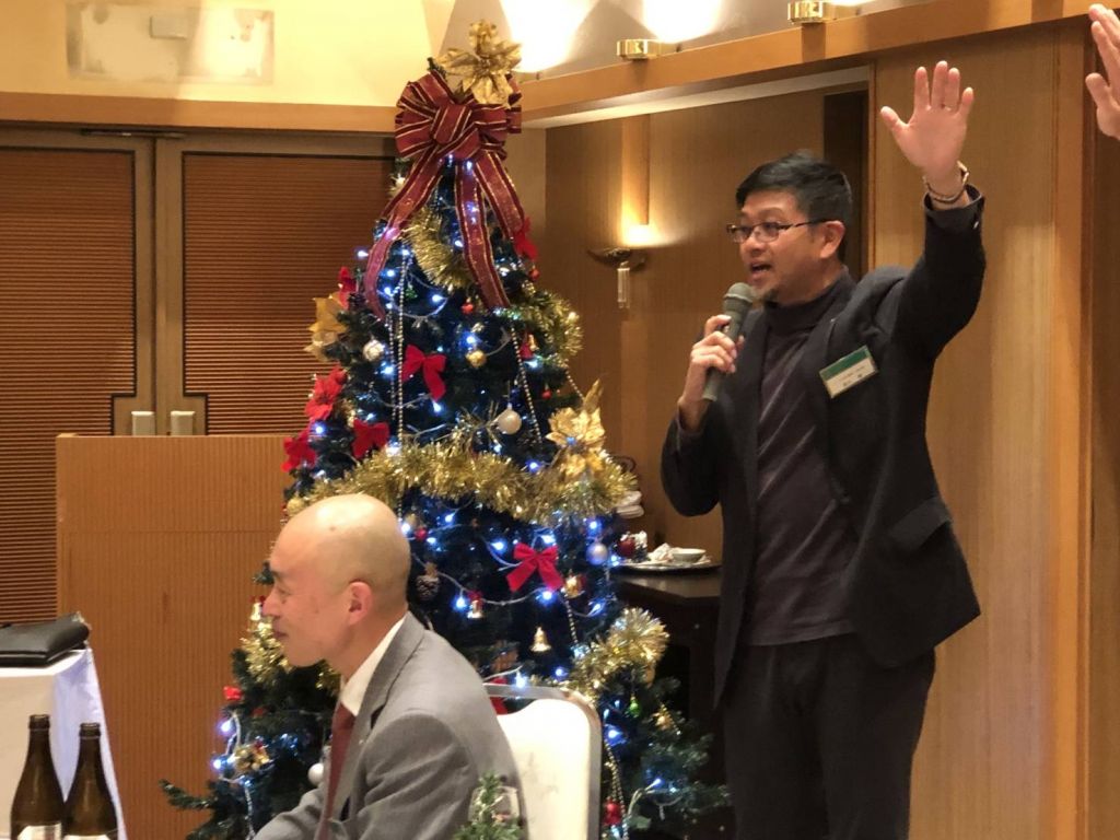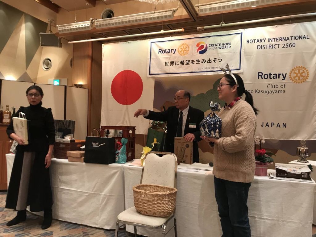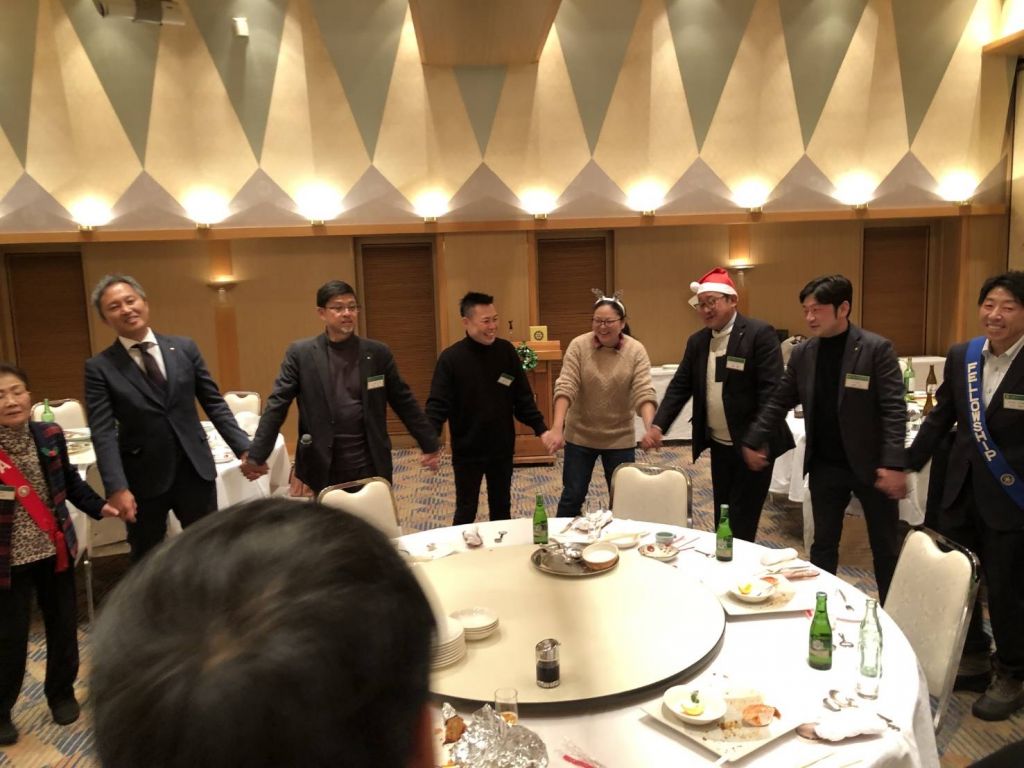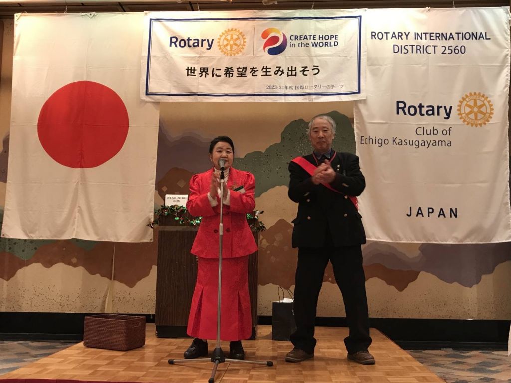12/21(木)第25回(通算第1497回)例会を開催しました。本日はクリスマス家族例会でした。日頃より支えていただいているご家族をお迎えしての開催です。会場にはクリスマスツリーやクリスマスを彩るさまざまな飾り付けが施されました。今回は風間社会奉仕委員長の呼びかけでチャリティーバザーが企画され、会員が品物を持ち寄って清水職業奉仕委員長のMCで賑やかにバザーが行われました。このバザーで集められた収益金は全てフードバンクに寄付する予定となっています。クリスマスケーキも用意されお子様たちにも喜んでいただきました。最後は参加者全員で「手に手をつないで」を合唱し、中締めは長谷川パスト会長、峯村パスト会長の音頭により、当クラブ恒例の越後春日山流三本締めでお開きとなりました。参加してくださったご家族の皆さま、ありがとうございました。