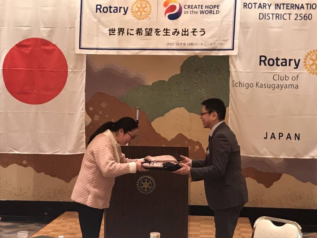 3/7(木)第36回(通算第1508回)例会を開催しました。本日は3月最初の例会のためロータリーソングのほか国歌斉唱を行いました。また、月に一度のMillionDollarMealの日でした。会員卓話では米山奨学生許雲霞さんのお別れ会が行われました。許さんは上越教育大学の大学院に留学され、当クラブでは2022年4月から米山奨学生としてお迎えして今月までの2年間、毎月例会に参加していただきました。当クラブの奉仕活動にも積極的に参加され、24時間募金活動や桜の木の手入れ、海岸清掃活動などでも一緒に汗をかいて活動していただきました。また、当クラブの茶道同好会の活動には、カウンセラーの稲葉会員から着物をお借りして和装に身をくるみ茶道体験をされたりと日本の文化にも触れていただきました。出席した会員からは許さんへの思い出が語られ、稲葉会員の計らいで浴衣と帯、クラブからは茶道具(お茶碗、茶筅、お抹茶)とお花がプレゼントされました。最後は全員で記念撮影をして思い出を作りました。過ぎてみればあっという間の2年間でしたが、大学を卒業して中国に帰られますが、たまには越後春日山ロータリークラブでの体験を思い出していただければ嬉しいです。また、これからは日本と中国の友好のためご尽力いただきたいと思います。2年間という長い間カウンセラーとして献身的に対応してくださった稲葉会員には、心から感謝申し上げます。大変お疲れ様でした。