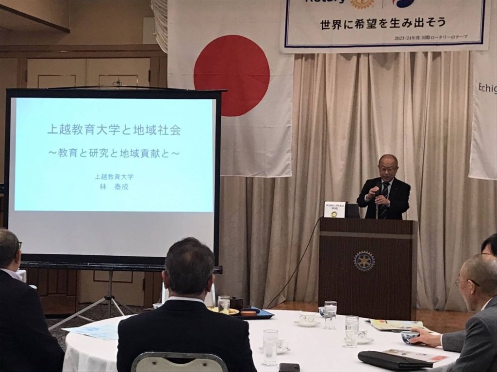 3/28(木)第39回(通算第1511回)例会を開催しました。本日例会の前に理事会が開催され小林幹事より報告がありました。食事後は、上越教育大学学長の林泰成様(高田RC所属)より「丈衛悦教育大学と地域社会~教育と研究と地域貢献と~」と題しご講話をいただきました。国立大学として経営に関するさまざまな課題や取組み、そして地域との関りについて詳しくお話をしていただきました。上越教育大学が設立された経緯なども知ることができ、貴重な学びの機会となりました。林学長様大変ありがとうございました。