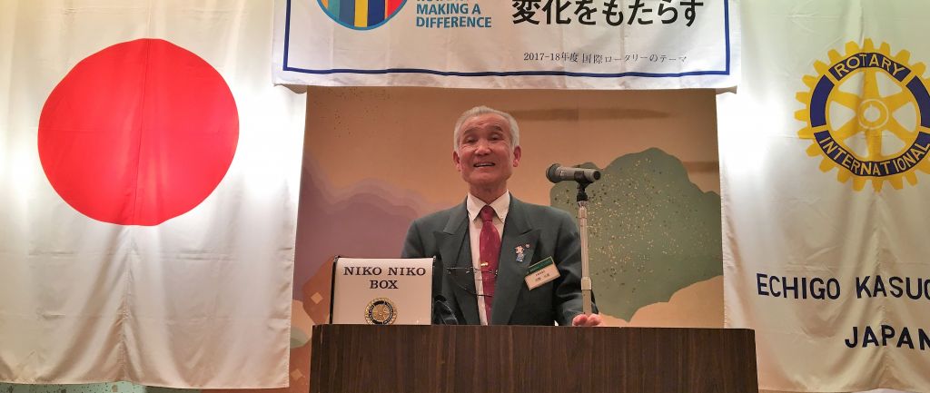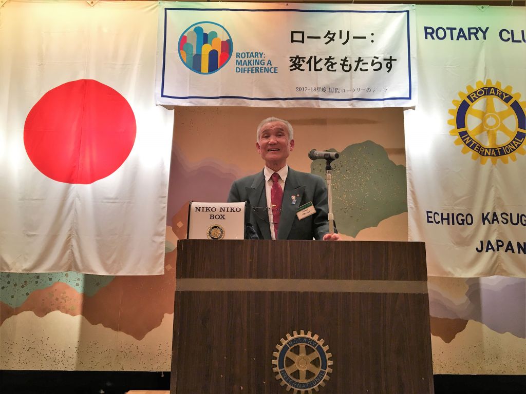 河野パスト会長は、2002-2003年度に会長を務め、1996年の入会した年に現在の公式ブレザーが作られたことや、当時のRI2560地区は、新潟県と群馬県が一緒だったことなどが紹介されました。そして、その時のRIのテーマが「慈愛の種をまきましょう」だったことから、当時に河野パスト会長が実践された「愛」について熱く語りました。