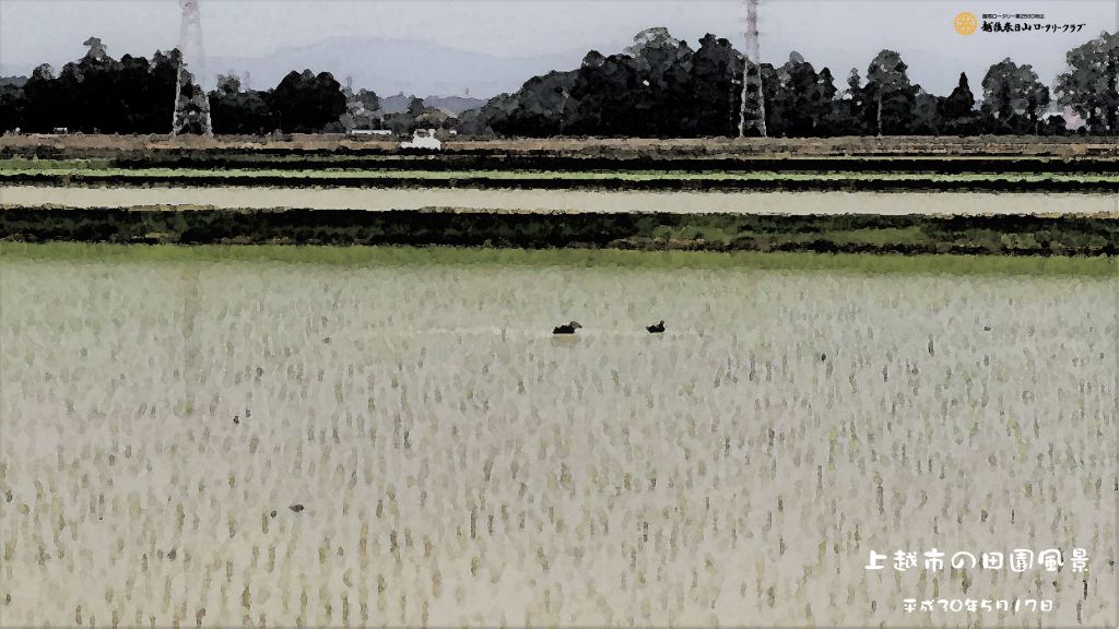 田植えを終えた田んぼには、たっぷりと張られた水の中に、綺麗に整列した薄緑色の稲が、美しい風景を作り出しています。そんな中で、鴨が悠々と泳いでいる姿は、心に安らぎを与えてくれます。曇り空が広がり、少し蒸し暑い感じの5月17日(木)に、例会を開催しました。