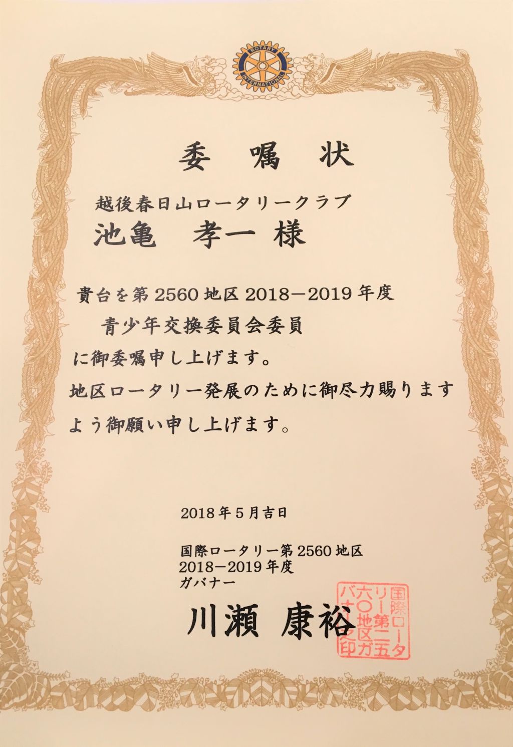 池亀孝一会員が、2018-2019年度第2560地区の青少年交換委員会委員に任命され、日馬会長から委嘱状が手渡されました。