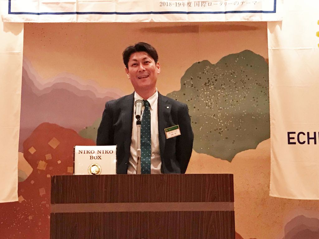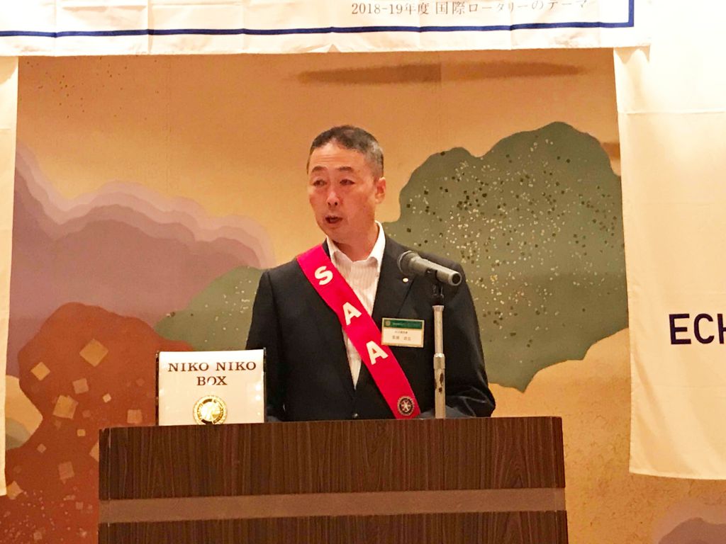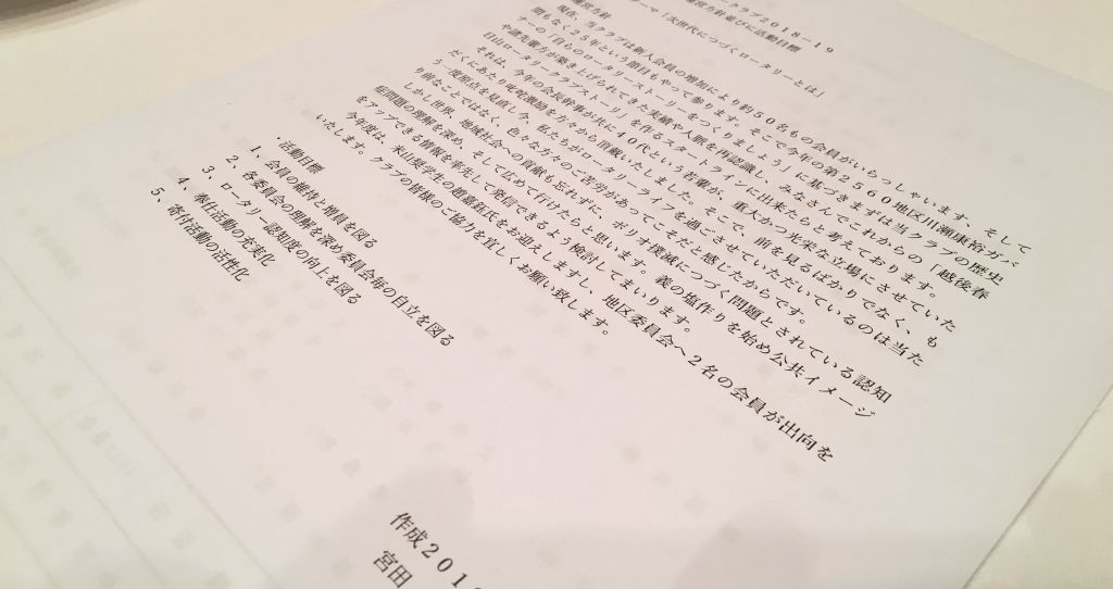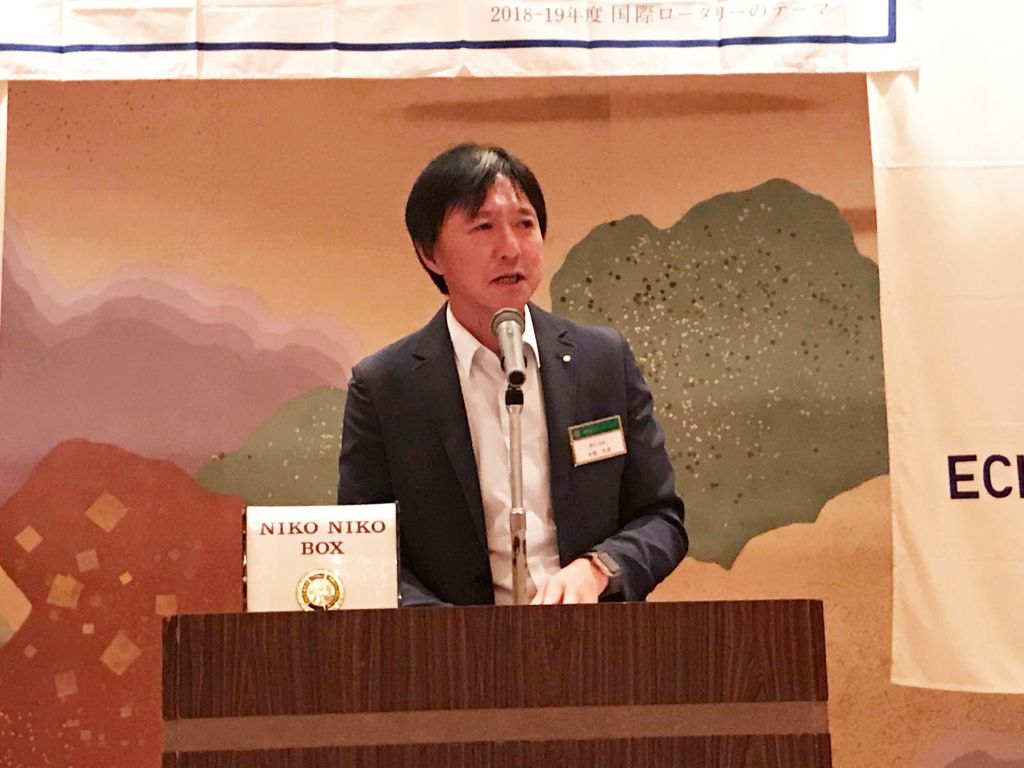 宮田会長の挨拶では、クラブテーマに「次世代につづくロータリーとは」が掲げられ、運営方針を発表しました。