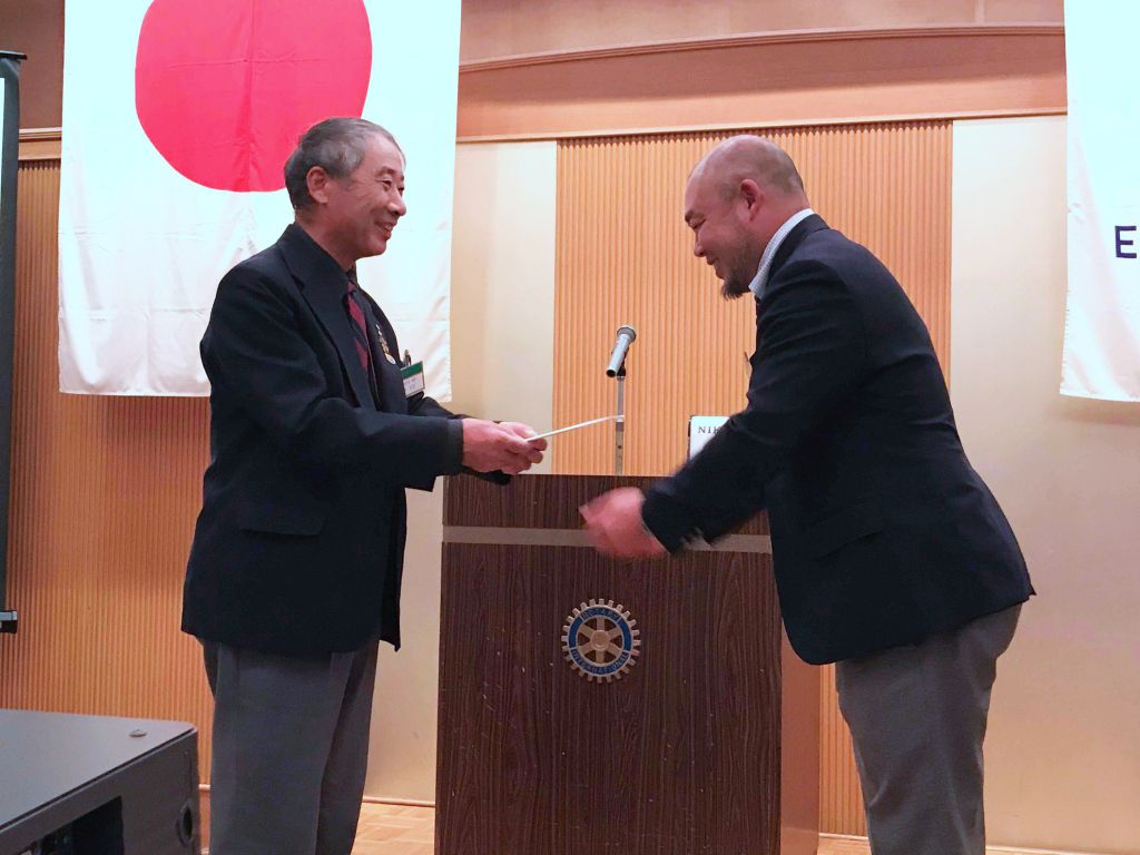 米山奨学生の趙嘉鈺(ちょかぎょく)が都合により出席できなかったため、代理でカウンセラーの峯村パスト会長に奨学金を手渡しました。
