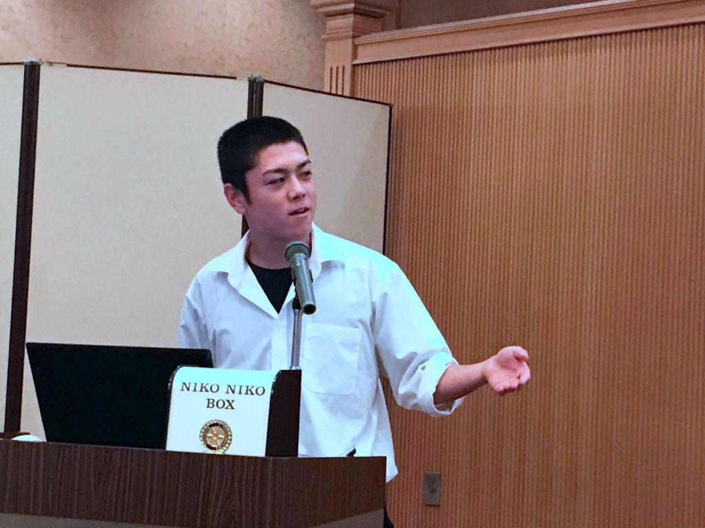 2560地区の青少年交換委員会の池亀委員は、ホストファミリーとしてアメリカからの短期留学生を受け入れたことや、ご子息の達矢さんが留学生としてアメリカに行く前や、帰って来てからの活動について報告しました。