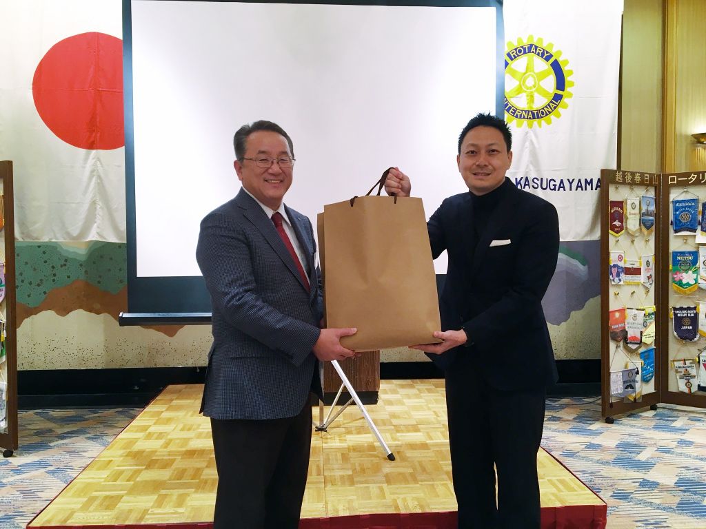 本日は、羽尾歯科医院の羽尾医院長をお招きして、1年間に回収された248本の歯ブラシを、国際奉仕委員会の大嶋浩文副委員長から贈呈いたしました。