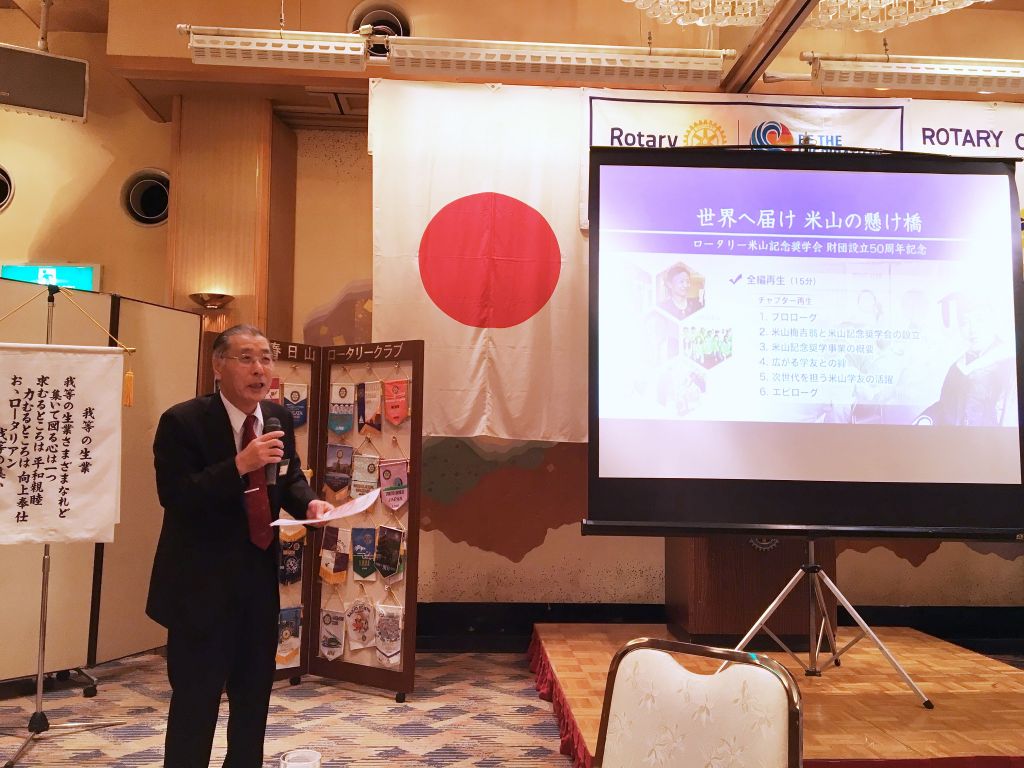 米山奨学委員会の荒川委員長からロータリー米山記念奨学事業について詳しい説明と「世界へ届け 米山の架け橋」と題したDVDが放映されました。
