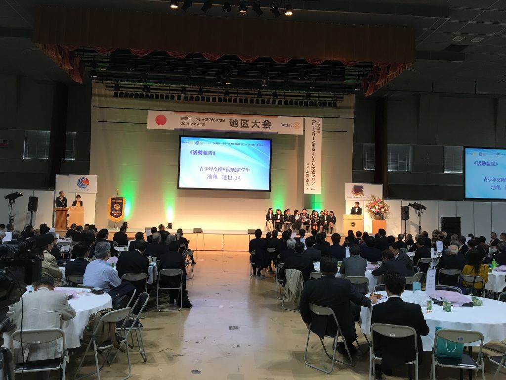 活動報告では、当クラブの池亀達矢さんが、青少年交換短期派遣学生を代表して発表をしました。1000人を目の前にして、堂々と発表する姿に感動しました。