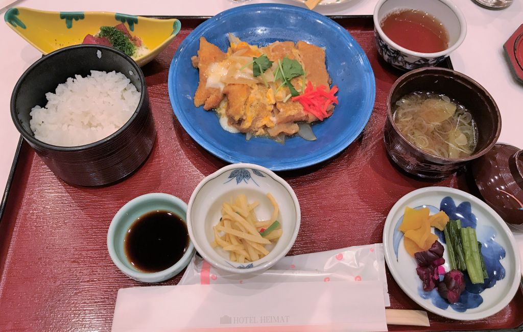 本日の食事のメニューは、「暑さに勝つ?」の験を担いだおいしい「かつ煮定食」でした。暑さで食欲が落ちるこの季節に、しっかりと「かつ」を補充して夏バテ防止にと、ハイマート様より心遣いをいただきました。