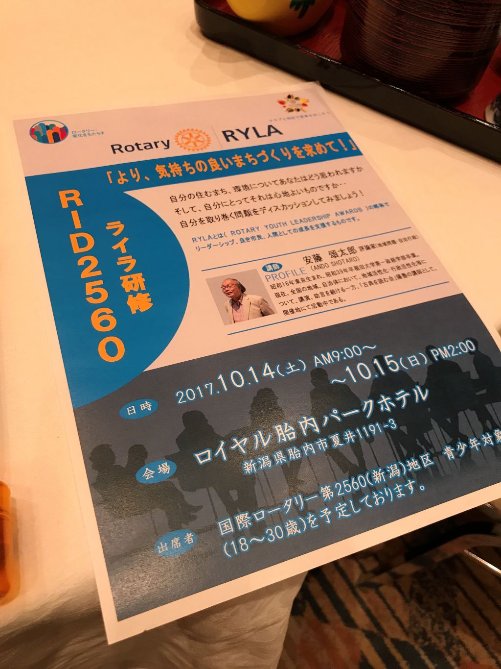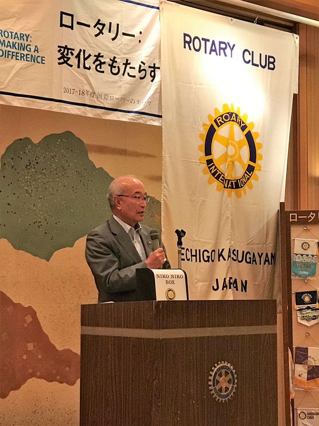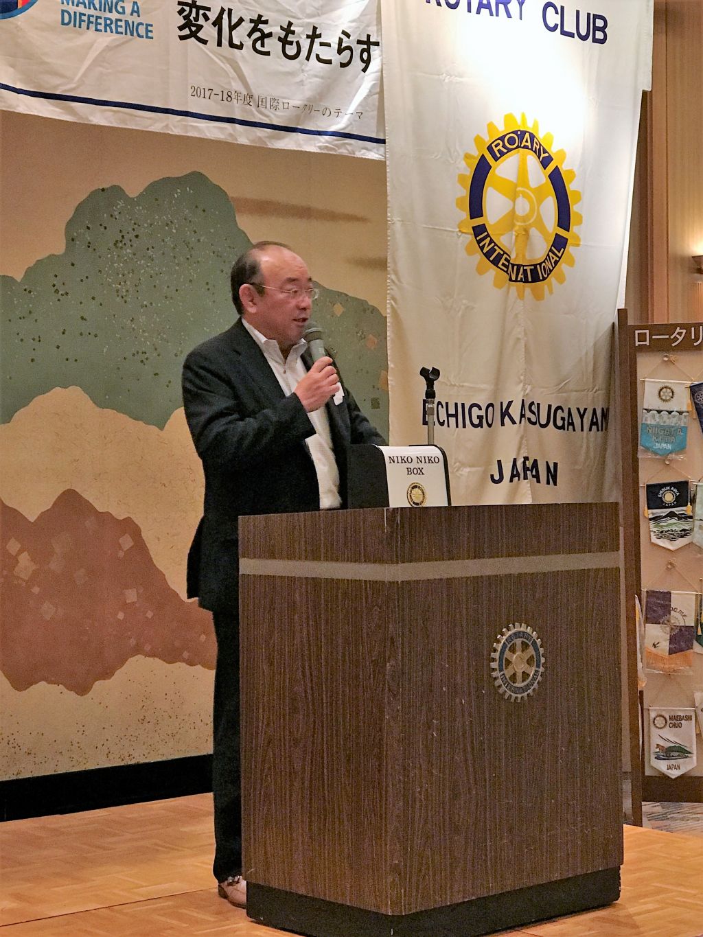 前川様は、10月14日にロイヤル胎内パークホテルで行われるライラ研修のご案内と、直江津ロータリークラブが今年で設立60周年を迎えられることから、60周年の記念事業への出席のご案内をいただきました。