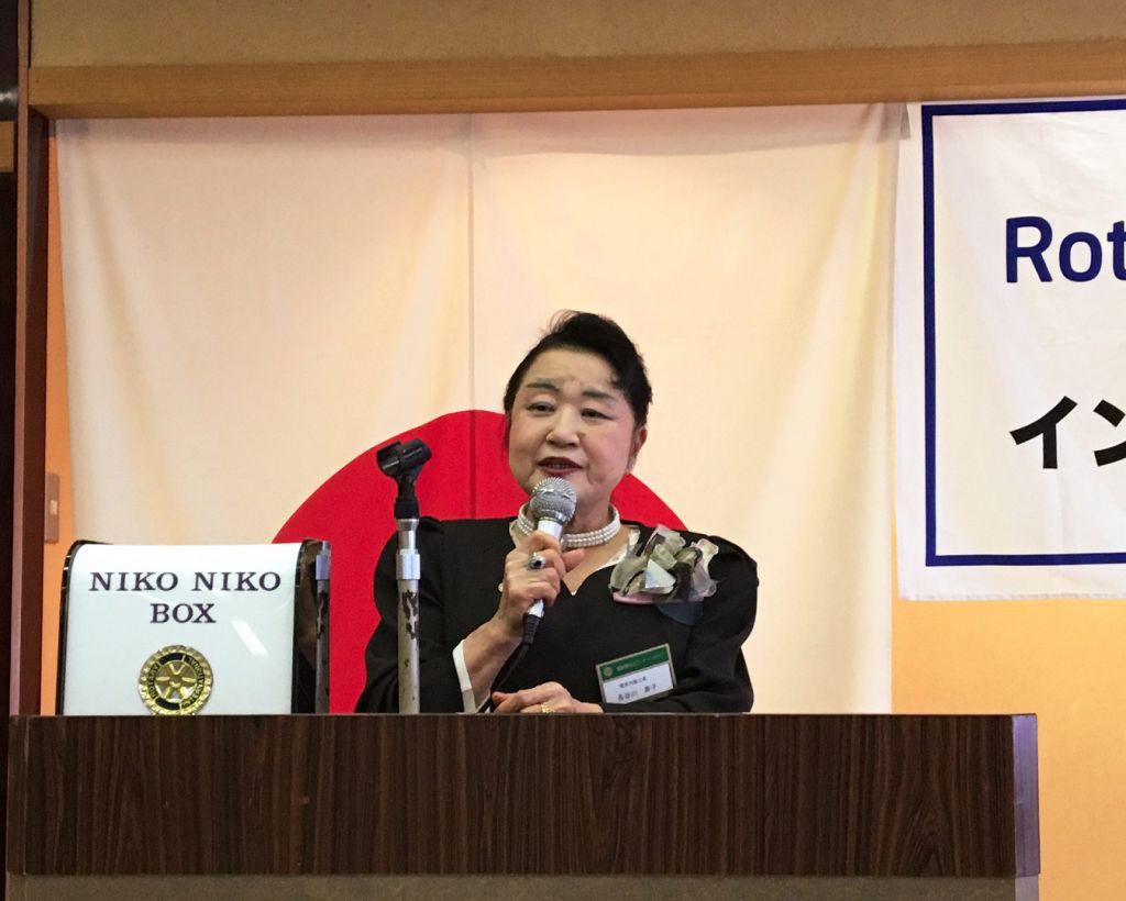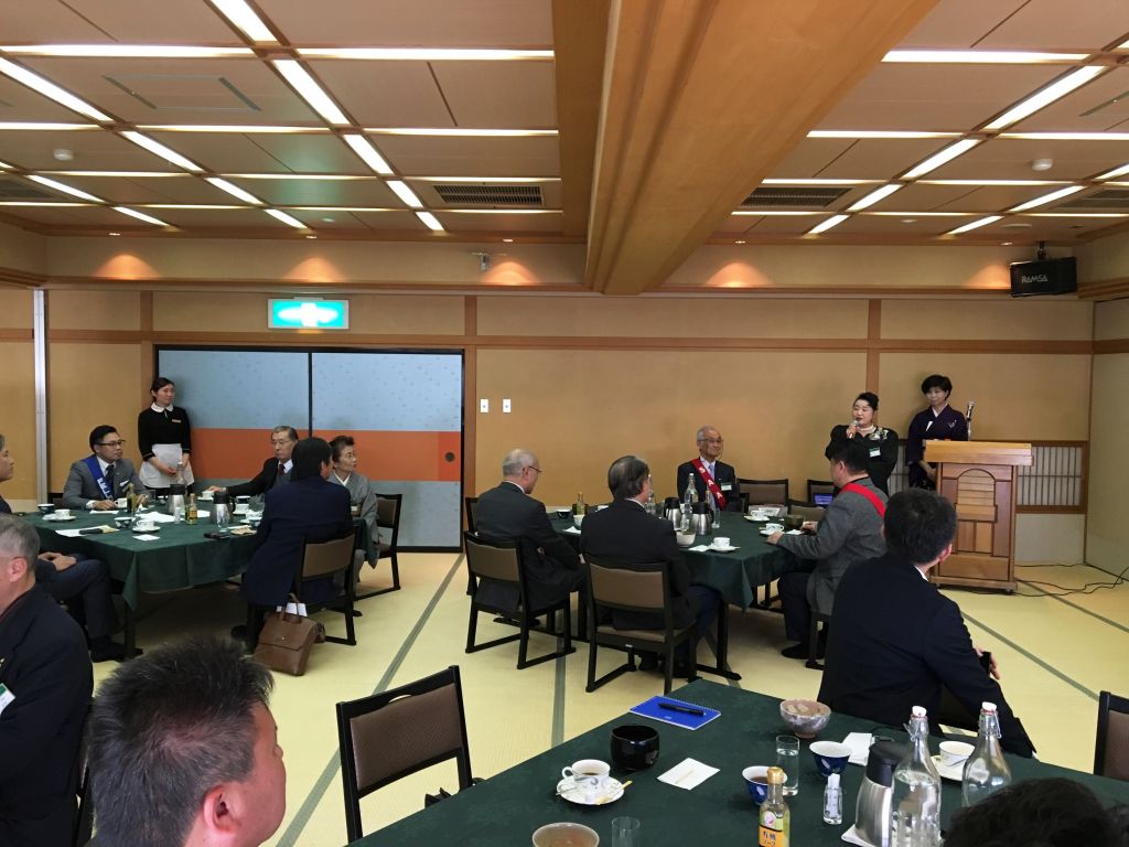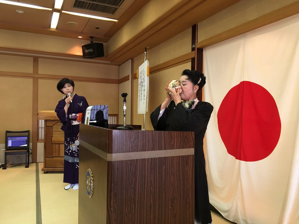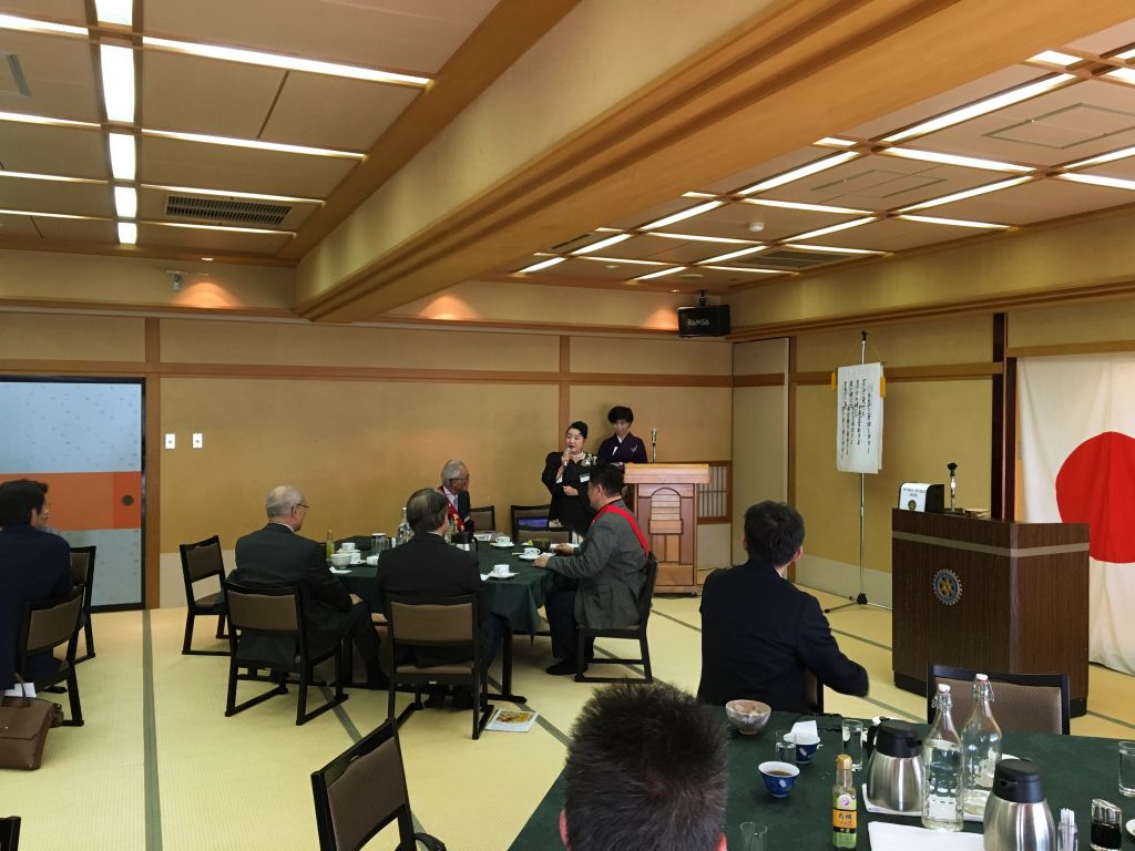 本日は例会場をホテルハイマートの広い畳敷きの部屋に移して、男性にはあまり機会が少ない茶道を当クラブの女性会員が中心になって、お抹茶やお菓子の作法を学ぶ講座を開きました。