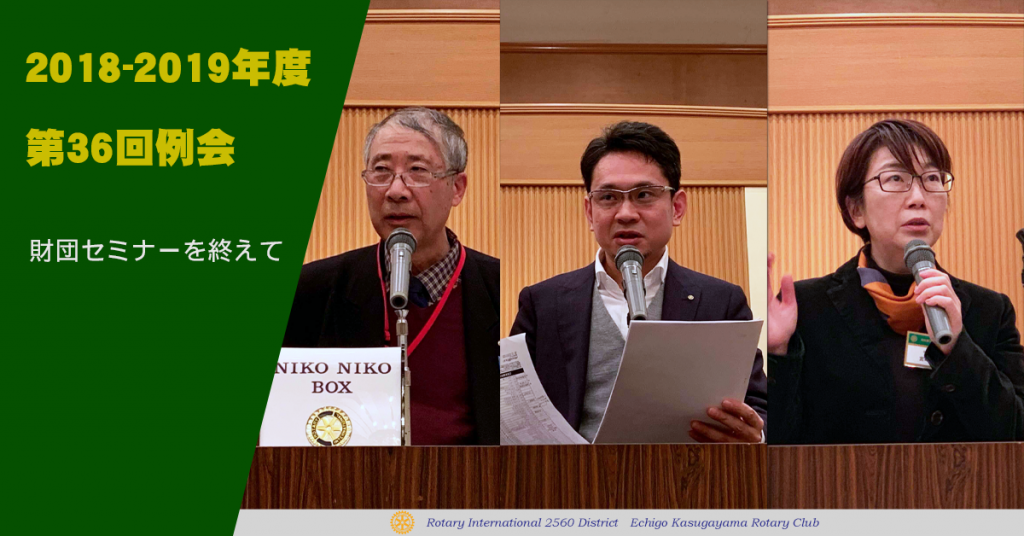 去る2月16日に「第2回ロータリー財団セミナー・資金管理セミナー」が新潟市で行われ、当クラブからは次年度会長の田辺剛会員と次年度ロータリー財団委員長の峯村正文パスト会長、そして第2560地区ロータリー財団委員である宮崎朋子会員が参加して、参加した3名よりそれぞれ報告がありました。