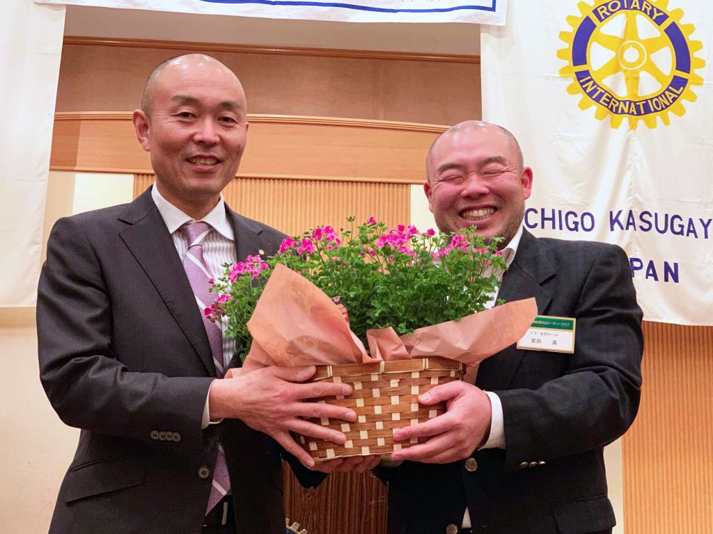 宮田会長より佐藤会員の奥様にお花が贈呈されました(会長の笑顔も添えられて)
