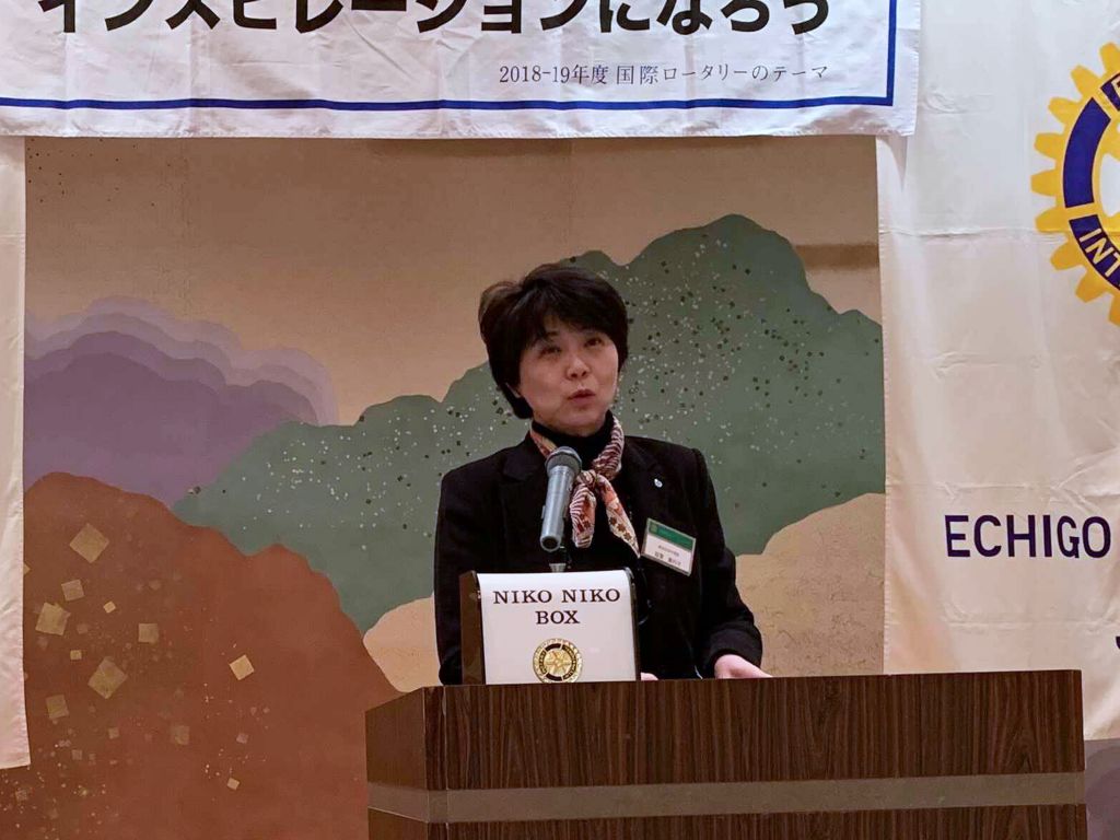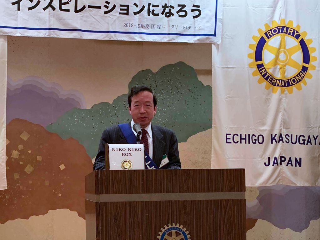 次年度の国際ロータリークラブ(RI)会長エレクトは、マークダニエル・マローニー(アメリカ、サンディエゴ)さんで「ロータリーは世界を繋ぐ」をテーマとしました。そして、これを受けて大谷ガバナーエレクトは「楽しいロータリーで繋がろう」をテーマに掲げられました。ここ数年は、国際ロータリークラブ会長の方針の下に新しい時代に沿ったロータリークラブに変化しており、次年度のガバナー公式訪問も今までとは違うスタイルに変更されるとのことで田辺会長エレクトは、マローニーRI会長エレクトや大谷ガバナーエレクトの方針に沿って、新しい波にも果敢にチャレンジし当クラブの特徴を出して会員の協力を得ながらクラブ運営をして行きたいと述べました。